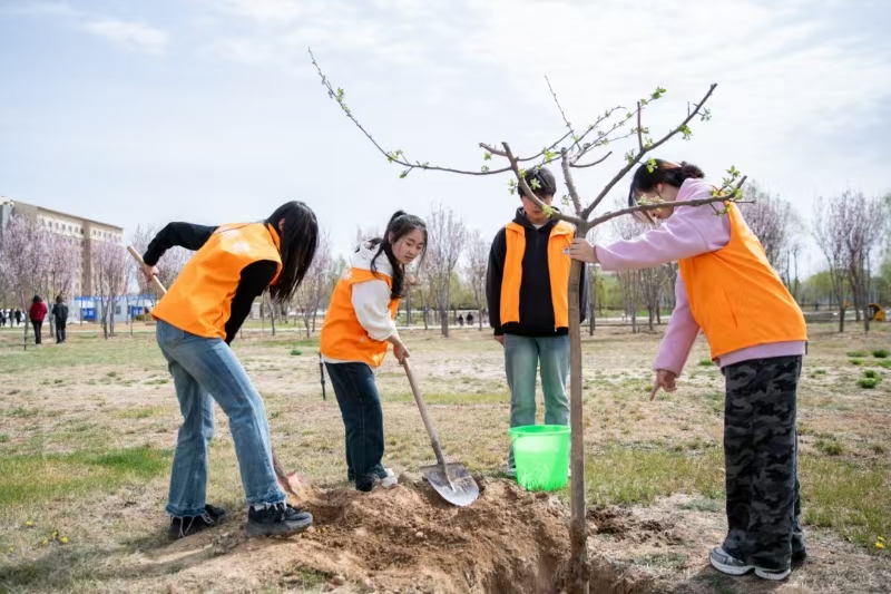活動(dòng)現(xiàn)場,師生們在服務(wù)保障處工作人員的指導(dǎo)下一起插苗、扶正、覆土、澆水,共同種下130余株海棠、山楂樹。春風(fēng)中,棵棵樹苗綠葉輕搖、花蕾初綻,為校園春景增加一抹生機(jī)。
