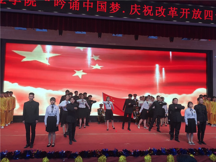 為慶祝改革開放四十周年,豐富校園文化生活,激發(fā)廣大青年的愛國(guó)主義熱情,增強(qiáng)愛國(guó)意識(shí),引導(dǎo)廣大團(tuán)員青年積極弘揚(yáng)社會(huì)主義核心價(jià)值觀,樹立堅(jiān)定的理想信念。12月13日晚,學(xué)校團(tuán)委舉行“吟誦中國(guó)夢(mèng)·慶祝改革開放四十周年”朗誦比賽活動(dòng)。校領(lǐng)導(dǎo)劉生肸、任世偉、黃剛、趙建澤及500余名師生代表共同觀看演出。
