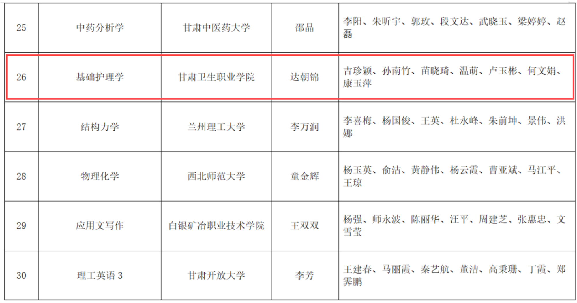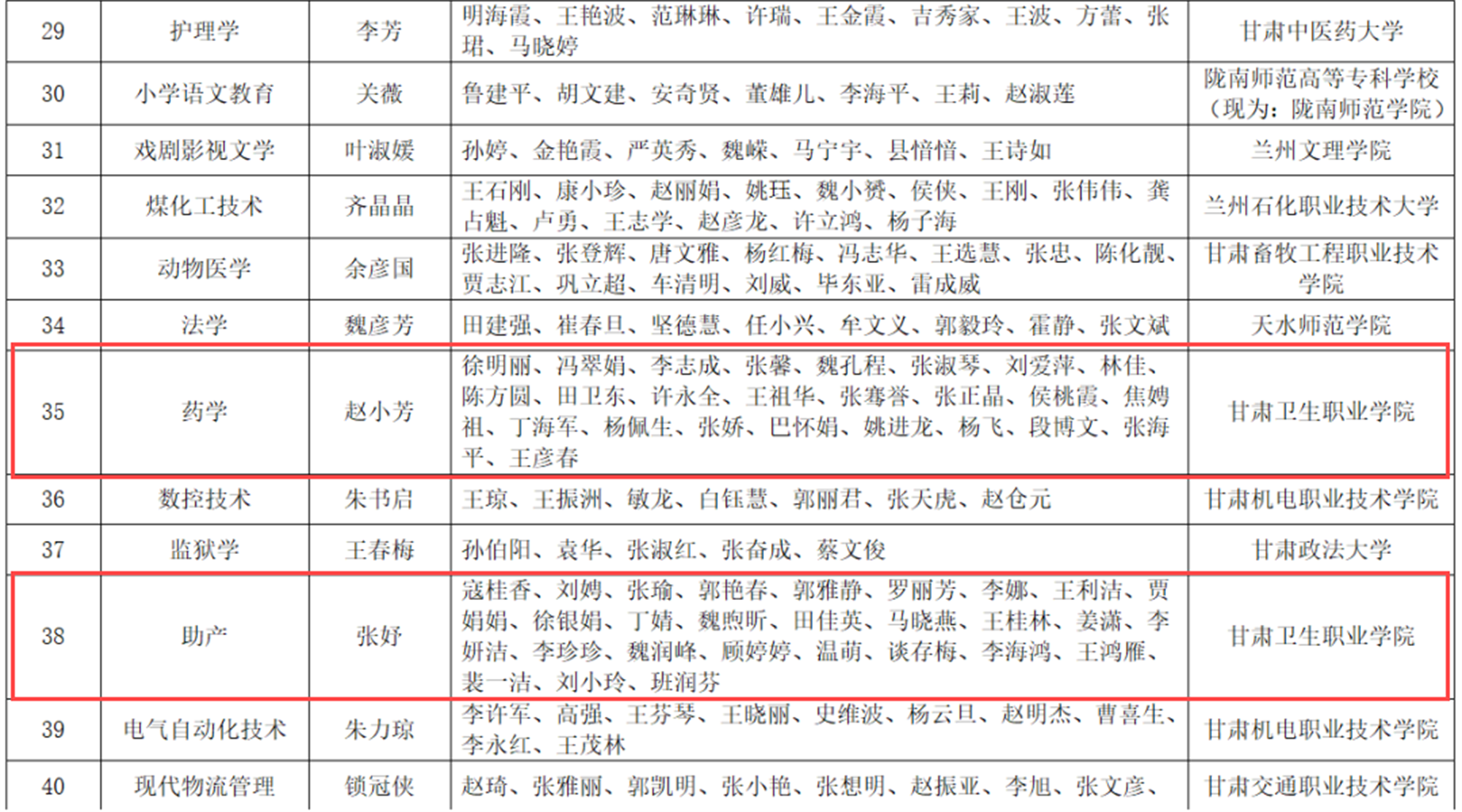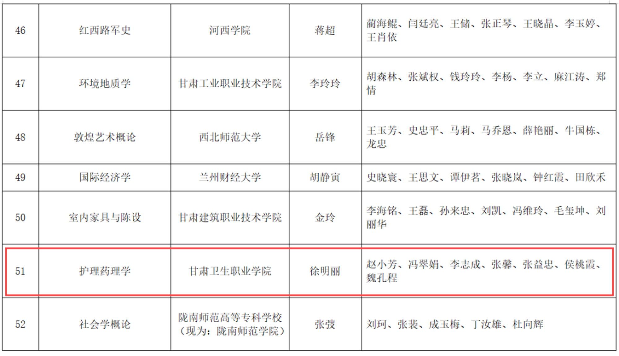 近日,甘肅省教育廳印發(fā)《關(guān)于公布第二批甘肅省高校課程思政示范項目名單的通知》(甘教高函〔2024〕16 號),我校推薦申報的藥學(xué)和助產(chǎn)2個專業(yè)均獲批甘肅省課程思政示范專業(yè),由達朝錦老師領(lǐng)銜的《基礎(chǔ)護理學(xué)》和徐明麗老師領(lǐng)銜的《護理藥理學(xué)》2門課程及其教學(xué)團隊分別獲批甘肅省課程思政示范課程、教學(xué)名師和團隊。