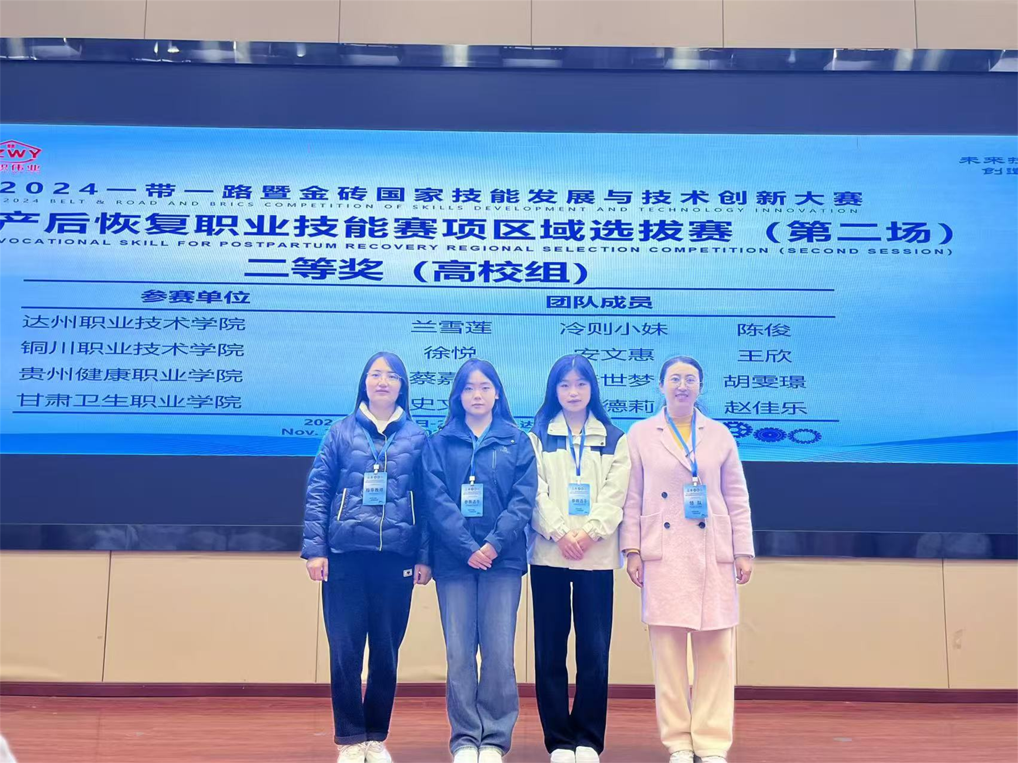 11月22日至24日,“2024一帶一路暨金磚國(guó)家技能發(fā)展與技術(shù)創(chuàng)新大賽”首屆產(chǎn)后恢復(fù)職業(yè)技能賽項(xiàng)選拔賽在四川達(dá)州職業(yè)技術(shù)學(xué)院舉辦。由我校護(hù)理學(xué)院張艾麗、馬曉燕兩位老師指導(dǎo)的史文杰、張德莉、趙佳樂(lè)三位同學(xué)憑借扎實(shí)的專業(yè)技能和出色的臨場(chǎng)表現(xiàn),榮獲大賽二等獎(jiǎng)。