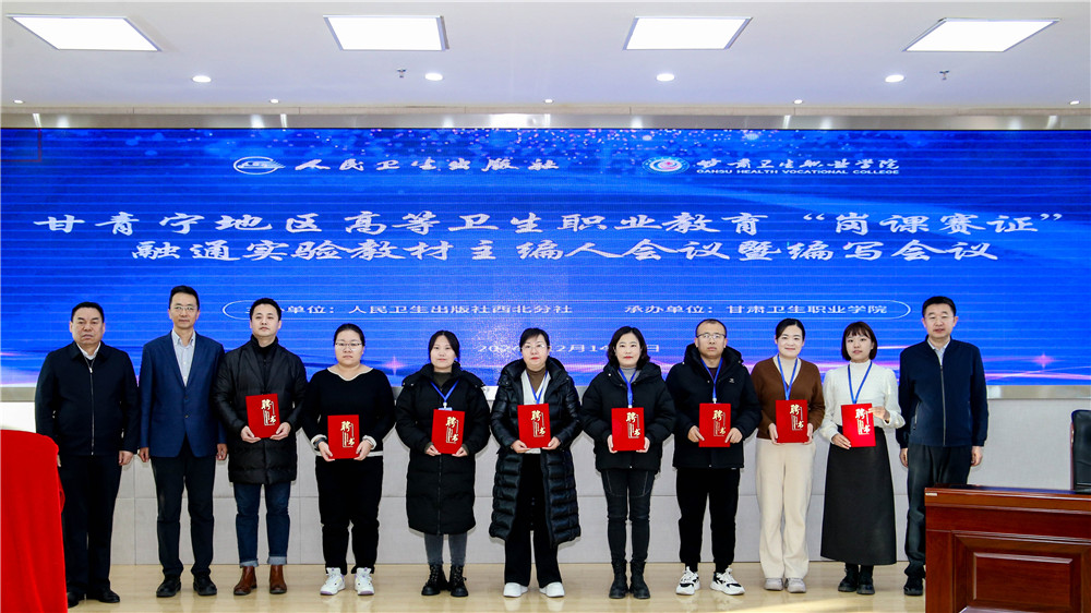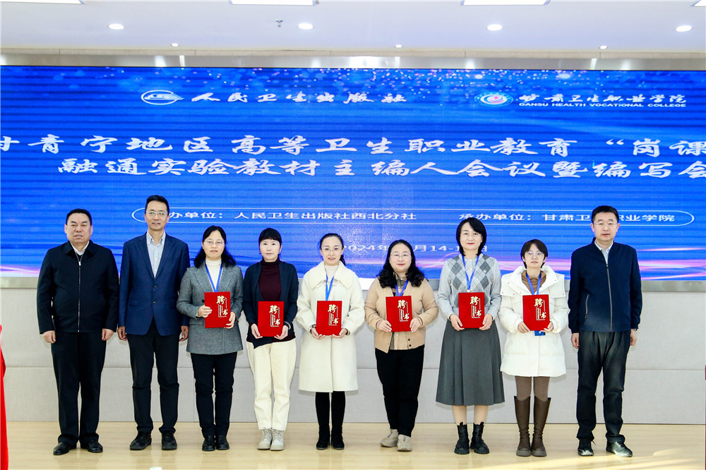 12月15日,由人民衛(wèi)生出版社西北分社主辦,甘肅衛(wèi)生職業(yè)學(xué)院承辦的甘青寧地區(qū)高等衛(wèi)生職業(yè)教育“崗課賽證”融通實(shí)驗(yàn)教材主編人會(huì)議暨編寫(xiě)會(huì)議在我校綜合辦公樓8樓會(huì)議室召開(kāi)。人民衛(wèi)生出版社拓展總監(jiān)、人民衛(wèi)生出版社西北分社董事長(zhǎng)石雄,人民衛(wèi)生出版社西北分社總編輯陳東樞、編輯部副主任汪信武、數(shù)字部副主任郅夢(mèng)杰,我校黨委書(shū)記包磊,黨委副書(shū)記、校長(zhǎng)王建成,副校長(zhǎng)張軍榮、楊頻出席會(huì)議。人衛(wèi)社和西北分社相關(guān)編輯,來(lái)自甘肅、寧夏、青海等地的專(zhuān)家、學(xué)者、教師參加會(huì)議,共同探索衛(wèi)生職業(yè)教育教材創(chuàng)新發(fā)展之路,助力人才培養(yǎng)與行業(yè)需求的精準(zhǔn)對(duì)接。
