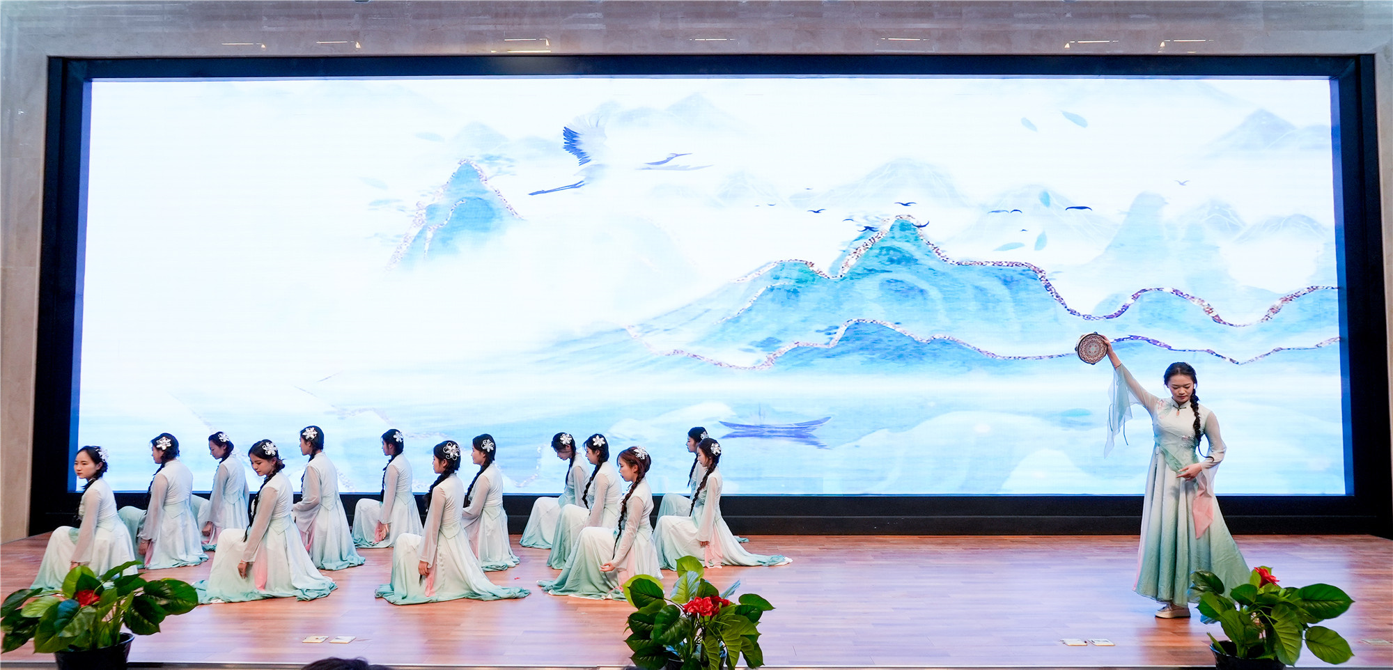 晚會(huì)節(jié)目包含歌曲獨(dú)唱、合唱,古典舞、民族舞,古箏、吉他、嗩吶、竹笛等器樂演奏,人屏互動(dòng)表演等多種形式,學(xué)校師生節(jié)目與實(shí)習(xí)生匯報(bào)節(jié)目交叉上演。從大漠駝鈴般的豪邁,到江南絲竹般的婉約;從濃烈的民族豪情,到深刻的青春哲思,本場(chǎng)晚會(huì)全方位勾勒出兩校美育協(xié)作的立體圖景。