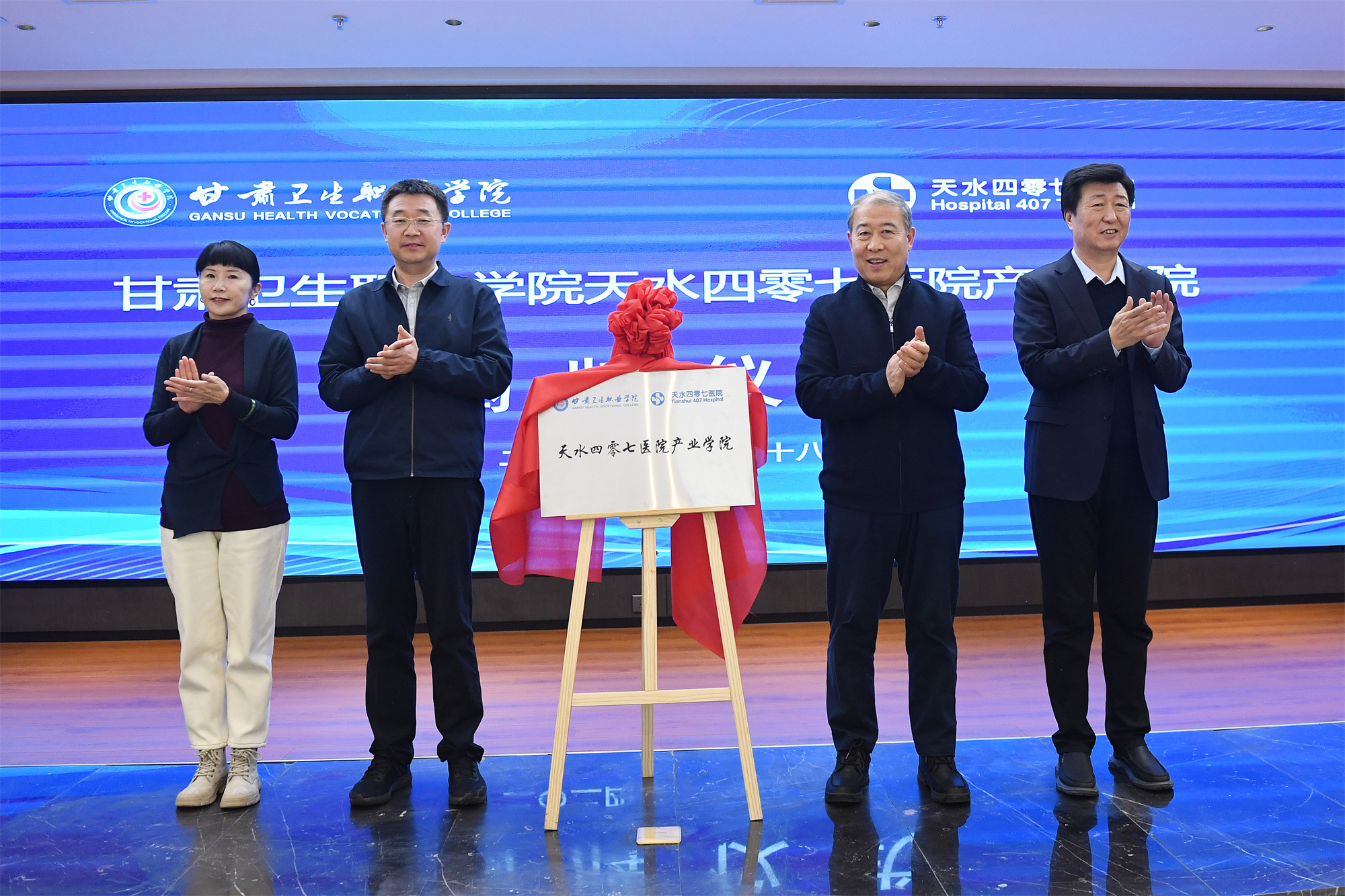 12月18日在天水四零七醫(yī)院舉行甘肅衛(wèi)生職業(yè)學(xué)院天水四零七醫(yī)院產(chǎn)業(yè)學(xué)院揭牌儀式。甘肅省醫(yī)藥健康產(chǎn)業(yè)發(fā)展協(xié)會(huì)會(huì)長李存文、副會(huì)長兼秘書長董信春、甘肅衛(wèi)生職業(yè)學(xué)院校長王建成、副校長張軍榮、天水四零七醫(yī)院黨委書記兼董事長楊友良以及醫(yī)院領(lǐng)導(dǎo)班子、中層干部和員工代表等共100余人參加了揭牌儀式。天水四零七醫(yī)院院長孫榕在致辭中表示,產(chǎn)業(yè)學(xué)院的揭牌成立,是進(jìn)一步落實(shí)國家深化產(chǎn)教融合政策的具體體現(xiàn),也是促進(jìn)雙方高質(zhì)量發(fā)展共贏的重要舉措。校長王建成在講話中指出,甘肅衛(wèi)生職業(yè)學(xué)院天水四零七醫(yī)院產(chǎn)業(yè)學(xué)院的成立是深化產(chǎn)教融合、協(xié)同育人的一個(gè)里程碑時(shí)間,更是建立校企“強(qiáng)強(qiáng)聯(lián)手、合作共贏”的良好典范,校院雙方將攜手共進(jìn),互促互鑒,努力將產(chǎn)業(yè)學(xué)院打造成為培養(yǎng)高素質(zhì)應(yīng)用型人才的搖籃。儀式最后,李存文、王建成、楊友良、張軍榮共同為甘肅衛(wèi)生職業(yè)學(xué)院天水四零七醫(yī)院產(chǎn)業(yè)學(xué)院成立揭牌。