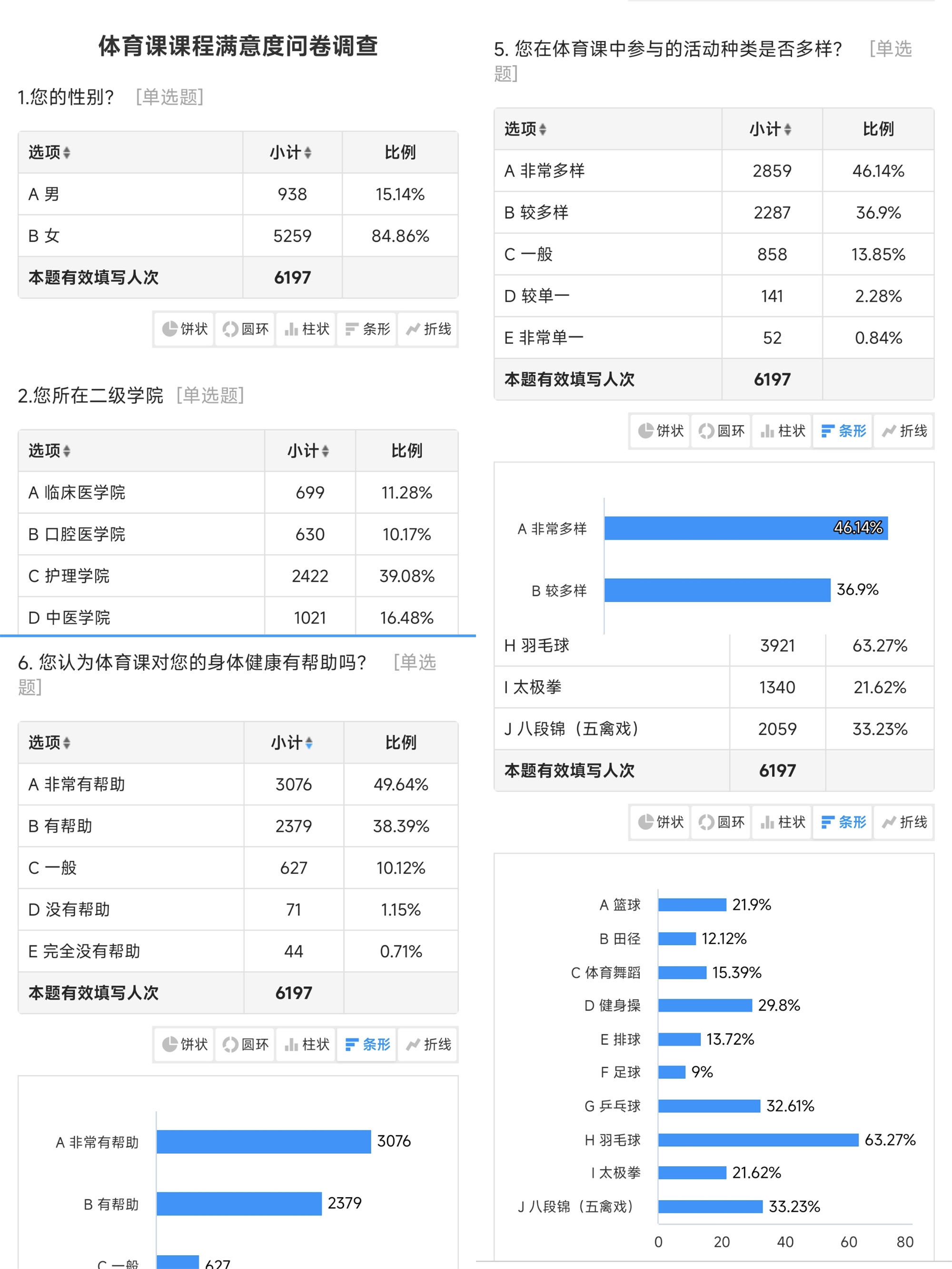 本次教學(xué)反饋會(huì)采用線上發(fā)放調(diào)查問(wèn)卷和現(xiàn)場(chǎng)會(huì)議相結(jié)合的形式開(kāi)展。參與問(wèn)卷調(diào)查的學(xué)生達(dá)6197人,較全面反映了體育課程的各個(gè)方面;現(xiàn)場(chǎng)參會(huì)的學(xué)生代表積極發(fā)言,從教學(xué)內(nèi)容、難易程度、校園競(jìng)賽、課外活動(dòng)、體質(zhì)監(jiān)測(cè)、場(chǎng)地器材等多個(gè)方面,分享了自己的學(xué)習(xí)體驗(yàn)和意見(jiàn)。
