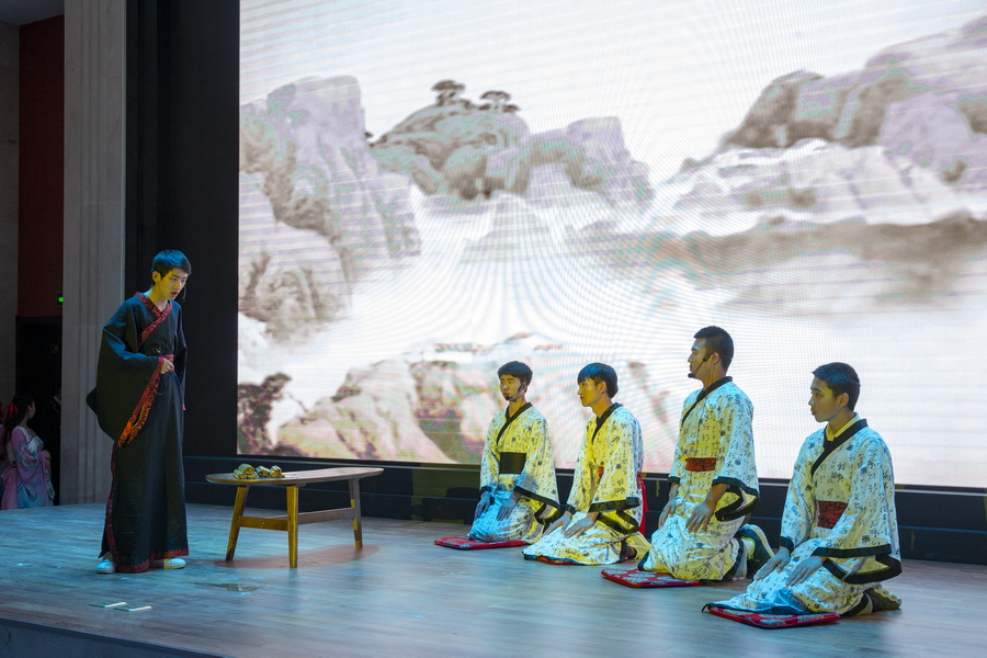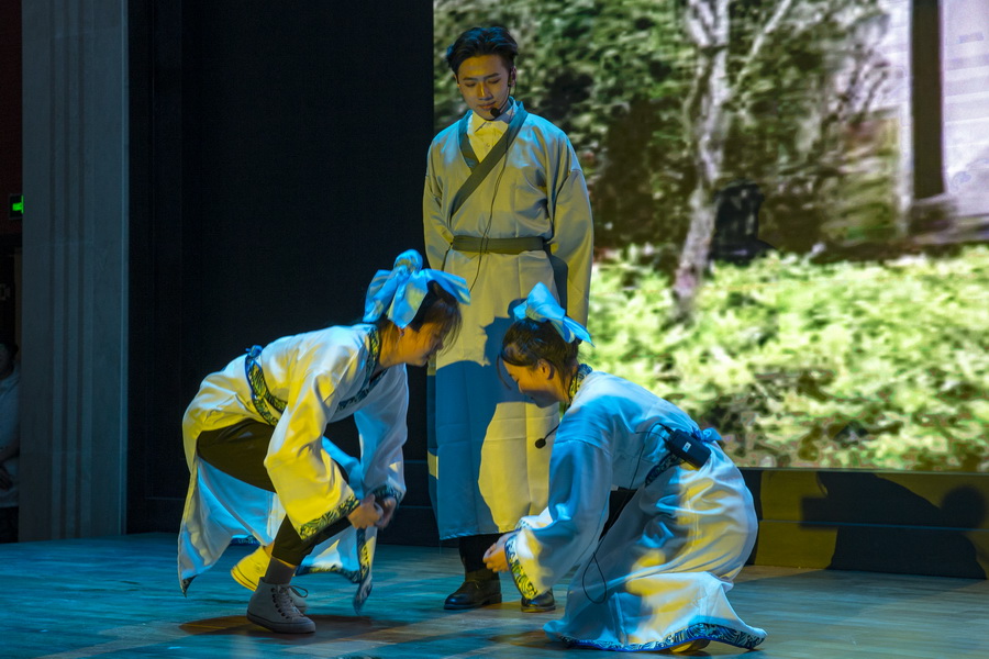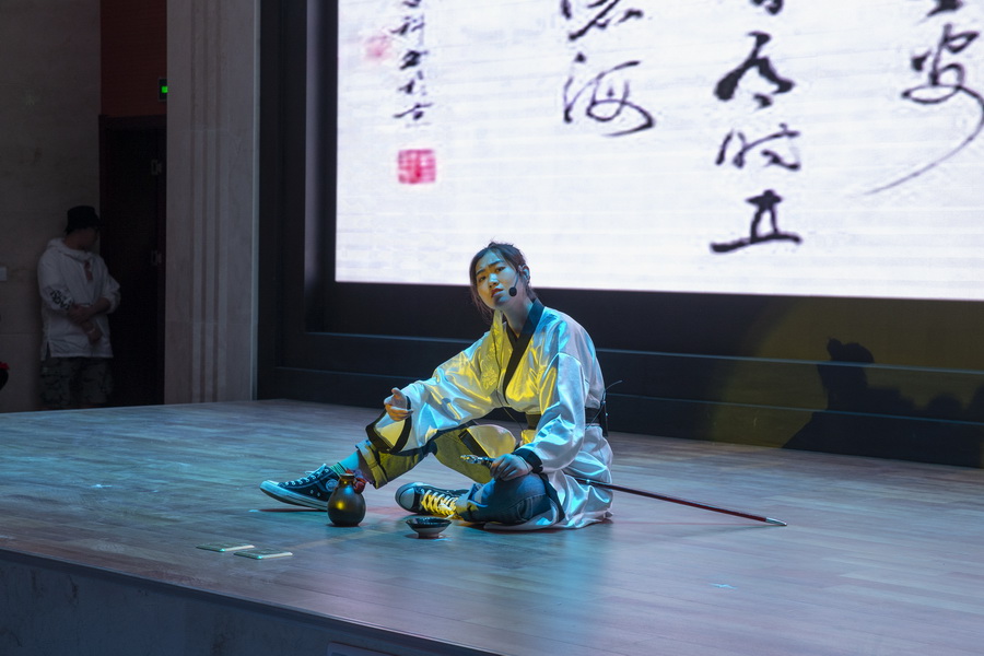 人生篇、生死篇皆由我校展演。詩(shī)如人生,人生如詩(shī),在明眸皓齒、言笑帶香的酥娘妙答里“此心安處是吾鄉(xiāng)”;在酒入豪腸、七分化作月光、三分嘯成了劍氣的詩(shī)仙李白的堅(jiān)信里“長(zhǎng)風(fēng)破浪會(huì)有時(shí),直掛云帆濟(jì)滄海”;在煮人生百味茶、看世間錦簇花的詞人晏殊的感嘆里,人生妙趣不過(guò)是“不如憐取眼前人”;在一念之間、天地皆寬的楊慎身上感念“古今多少事,都付笑談中”體悟青山不老,任憑世事翻卷,江水不息;最后傳入?yún)s倚杖柴門外、臨風(fēng)聽暮蟬的王維心中,王維如是說(shuō)“行到水窮處,坐看云起時(shí)。”這變化無(wú)常的人生從來(lái)沒有白走的路,幸福不會(huì)從天而降。