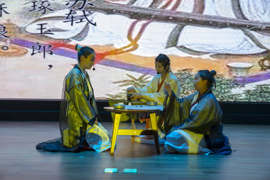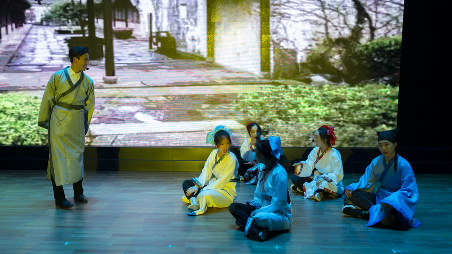 生死篇,古道人來(lái)人往,穿梭衣的男子在阡陌小路上行走,清明的異鄉(xiāng)恰逢清明雨,思起故鄉(xiāng),黃土衰草,滿心愁情不如清酒一壺,此時(shí),杜牧問(wèn)了小童;莊子與學(xué)生在學(xué)堂論道;“勸君莫惜金縷衣,勸君惜取少年時(shí)”儂儂軟語(yǔ)在女嬌娥的輕歌曼舞里;生命開出絢爛花最終綻放在“苔花如米小,也學(xué)牡丹開”的傲然中。與會(huì)嘉賓在《苔》的歌聲中合影留念,記錄美好光陰。