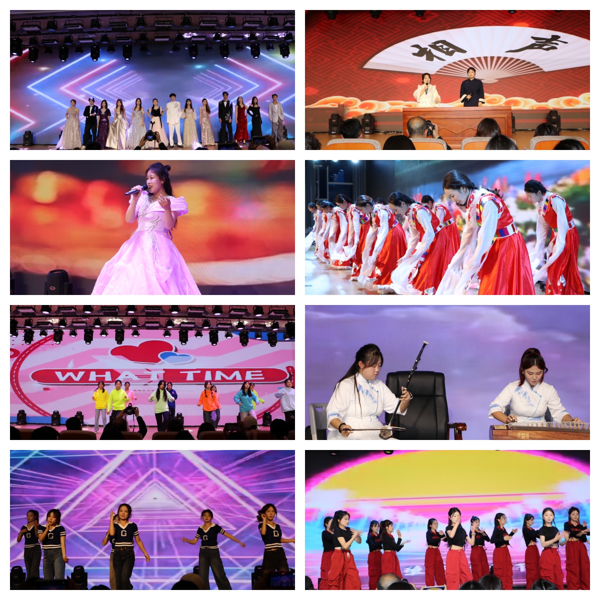 晚會(huì)回顧祖國(guó)七十六載輝煌歷程,表達(dá)對(duì)新生在醫(yī)學(xué)技術(shù)與工程領(lǐng)域逐夢(mèng)的期許。節(jié)目形式多樣,有舞蹈、獨(dú)唱、相聲、器樂(lè)合奏、T臺(tái)走秀等。2025級(jí)新生表演《愛(ài)如火》《嗨翻新生代》,舞步有力、活力四射,贏得喝彩;彩練舞蹈隊(duì)帶來(lái)《阿拉羌色》《光亮》,前者展現(xiàn)民族團(tuán)結(jié),后者傳遞向光力量;器樂(lè)合奏《盛世國(guó)樂(lè)》,古箏與二胡交織,盡顯傳統(tǒng)文化魅力;相聲《大話魯迅》融合文學(xué)與幽默;《未來(lái)已來(lái),就是現(xiàn)在》結(jié)合溫情與歡樂(lè),蒙面T臺(tái)秀添彩;《海芋戀》舞出浪漫清新,《We Rock》盡顯青春朝氣。特別是唐藝哲老師獨(dú)唱《越來(lái)越好》,歌聲飽含對(duì)生活和師生的祝福,旋律引發(fā)共鳴,掌聲與跟唱聲交織,將晚會(huì)推向小高潮。