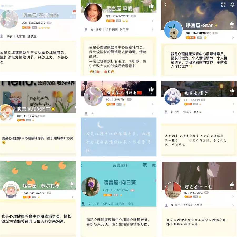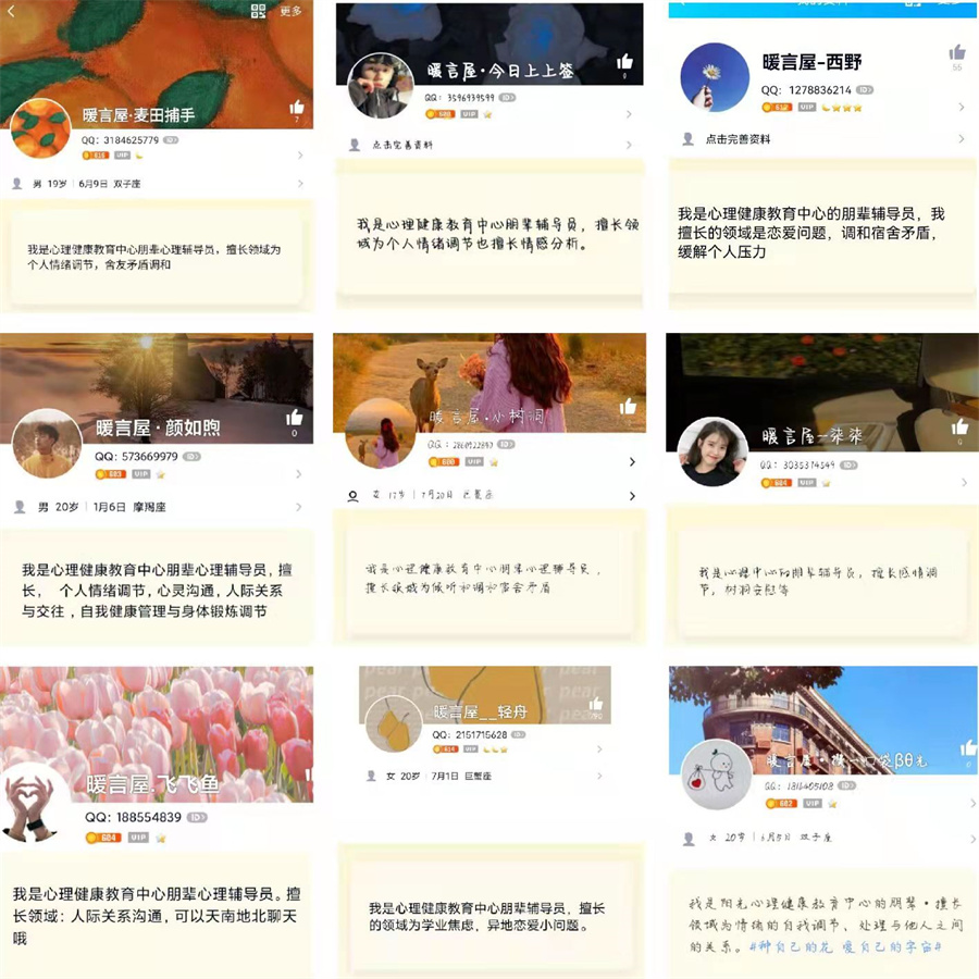 疫情封閉期間,同學(xué)們的情緒波動(dòng)如何排解?宿舍人際關(guān)系如何維護(hù)?怎樣提高網(wǎng)課學(xué)習(xí)效率?怎樣擁有更健康的心態(tài)?這些你都可以來(lái)到“暖言屋”尋找答案。在這里,同學(xué)們可以自主選擇朋輩心理輔導(dǎo)員進(jìn)行網(wǎng)絡(luò)聊天,朋輩心理輔導(dǎo)員將給予大家傾聽(tīng)、陪伴與支持。
