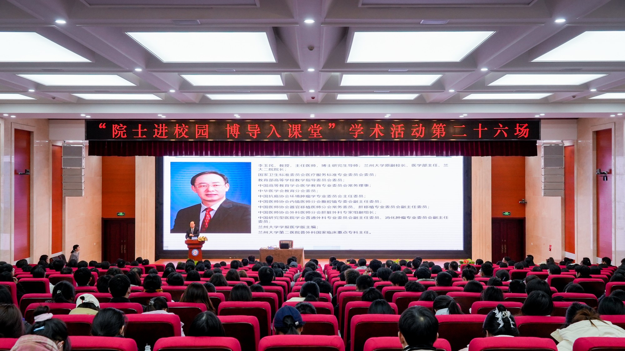 12月31日,學(xué)校科技講壇“院士進校園 博導(dǎo)入課堂”系列學(xué)術(shù)活動第二十六場講座在篤學(xué)樓多功能報告廳圓滿舉行。本次講座特邀蘭州大學(xué)萃英二級教授、主任醫(yī)師、博士研究生導(dǎo)師、英國劍橋大學(xué)訪問學(xué)者李玉民教授,為我校師生帶來了一場以“厚德精醫(yī)樹人 博學(xué)篤行育才”為主題的學(xué)術(shù)盛宴。學(xué)校包磊書記、王建成校長、張軍榮副校長及中青年教科研骨干教師、學(xué)生代表等400余人參加了此次講座,活動由副校長張軍榮主持。