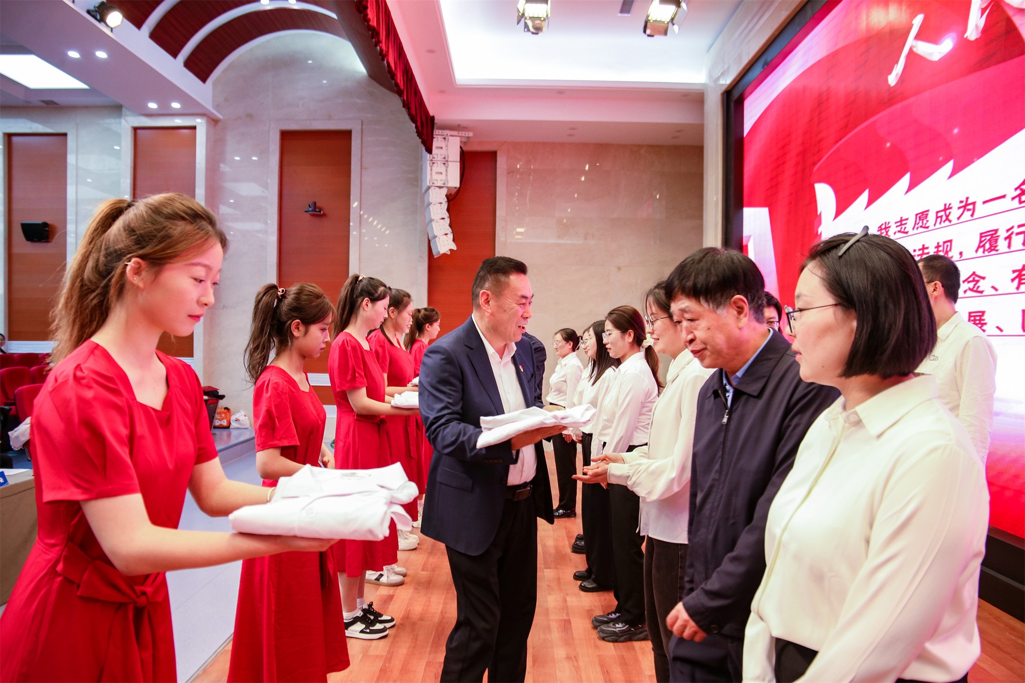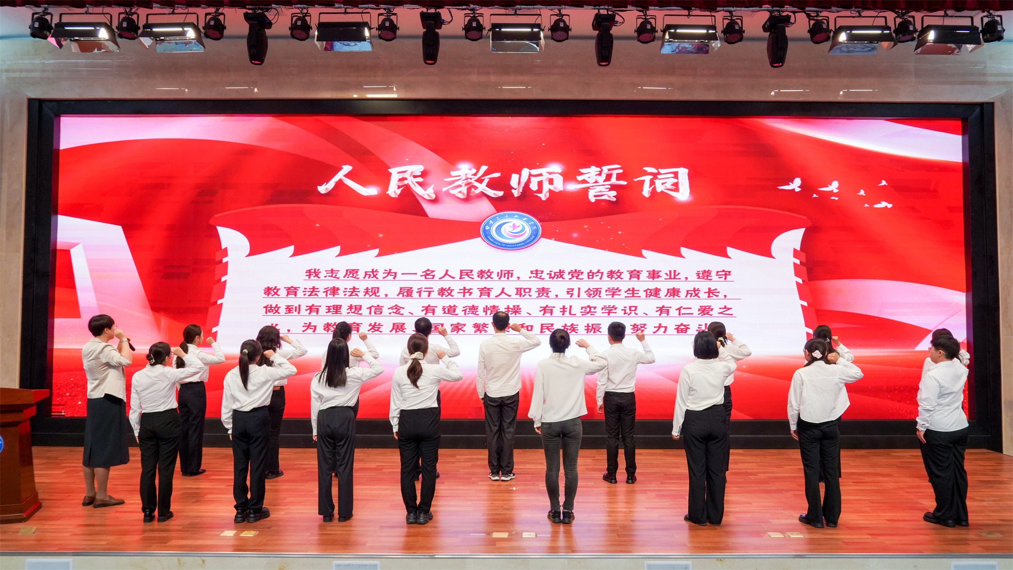 大會(huì)舉行了新教師入職宣誓儀式,17名新入職教師在莊重而溫馨的氛圍中依次上臺(tái),臨床醫(yī)學(xué)院院長(zhǎng)寇桂香教授作為老教師代表為新教師領(lǐng)誓,與會(huì)校領(lǐng)導(dǎo)為新入職教師授校徽和工作服。現(xiàn)場(chǎng)響起熱烈的掌聲,歡迎新同事加入衛(wèi)職院大家庭,共同投入到學(xué)校建設(shè)發(fā)展的光榮事業(yè)中。