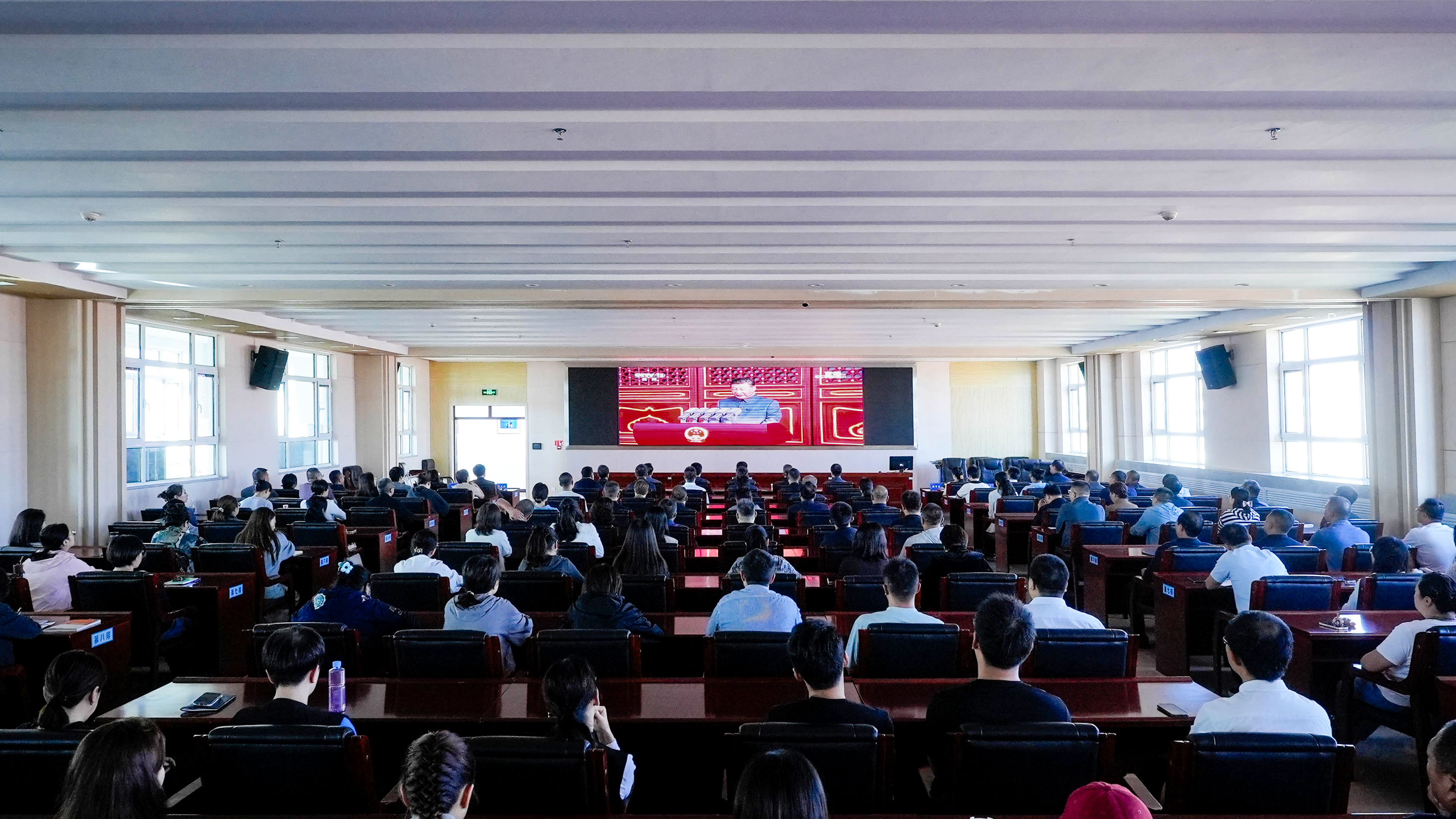 上午9時,全體校領(lǐng)導(dǎo)與行政工勤人員在勤篤樓會議室通過央視直播同步觀看大會盛況,各二級學(xué)院教職工在本學(xué)院會議室集中觀看,全體思政課教師緊跟時政,帶領(lǐng)學(xué)生在階梯教室觀看,校團委組織無課班級同步開展團日活動,由輔導(dǎo)員帶領(lǐng)團員學(xué)生在教室觀看,各專業(yè)課教師結(jié)合授課內(nèi)容帶領(lǐng)學(xué)生在教室觀看。