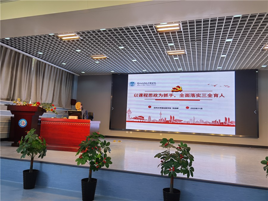 宋焱峰教授首先作了題為“以課程思政為抓手,全面落實(shí)三全育人”的主題講座。他從課程思政開展的時(shí)代背景、什么是“課程思政”、 如何推動課程思政、課程思政建設(shè)規(guī)劃、課程思政實(shí)例分析等五個方面,詳細(xì)解讀了習(xí)近平總書記關(guān)于教育工作的系列講話和重要指示,辨析了“課程思政”與“思政課程”的關(guān)系,精講了課程思政的內(nèi)涵和特征、對教師的要求、設(shè)計(jì)思路等;分享了蘭州大學(xué)基礎(chǔ)醫(yī)學(xué)院在課程思政建設(shè)方面的規(guī)劃 、經(jīng)驗(yàn)和成效;實(shí)例分析了如何在不同醫(yī)學(xué)專業(yè)課程中發(fā)掘思想政治教育元素,并將思政教育融入到課堂教學(xué)中,發(fā)揮專業(yè)課程的育人作用。