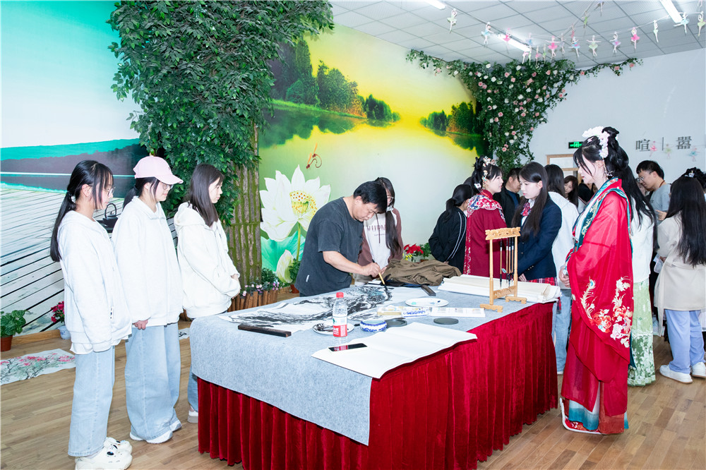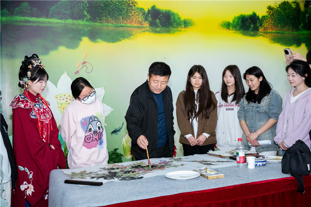 隨后,書畫名家與師生書畫愛好者進(jìn)行現(xiàn)場創(chuàng)作活動(dòng)。書畫家們揮毫潑墨,筆走龍蛇。書法作品或蒼勁有力,或飄逸靈動(dòng),書寫出中華經(jīng)典詩詞的韻味;繪畫作品則栩栩如生,花鳥魚蟲躍然紙上,山水意境引人入勝。他們精湛的技藝不僅展現(xiàn)了傳統(tǒng)書畫藝術(shù)的魅力,更讓在場師生近距離感受到了中華文化的博大精深。在創(chuàng)作過程中,嘉賓們還與師生親切互動(dòng),耐心講解書畫技巧和文化內(nèi)涵,指導(dǎo)學(xué)生進(jìn)行嘗試創(chuàng)作。學(xué)生們熱情高漲,紛紛拿起筆墨,在嘉賓的指導(dǎo)下認(rèn)真書寫、繪畫,現(xiàn)場氣氛熱烈而融洽。