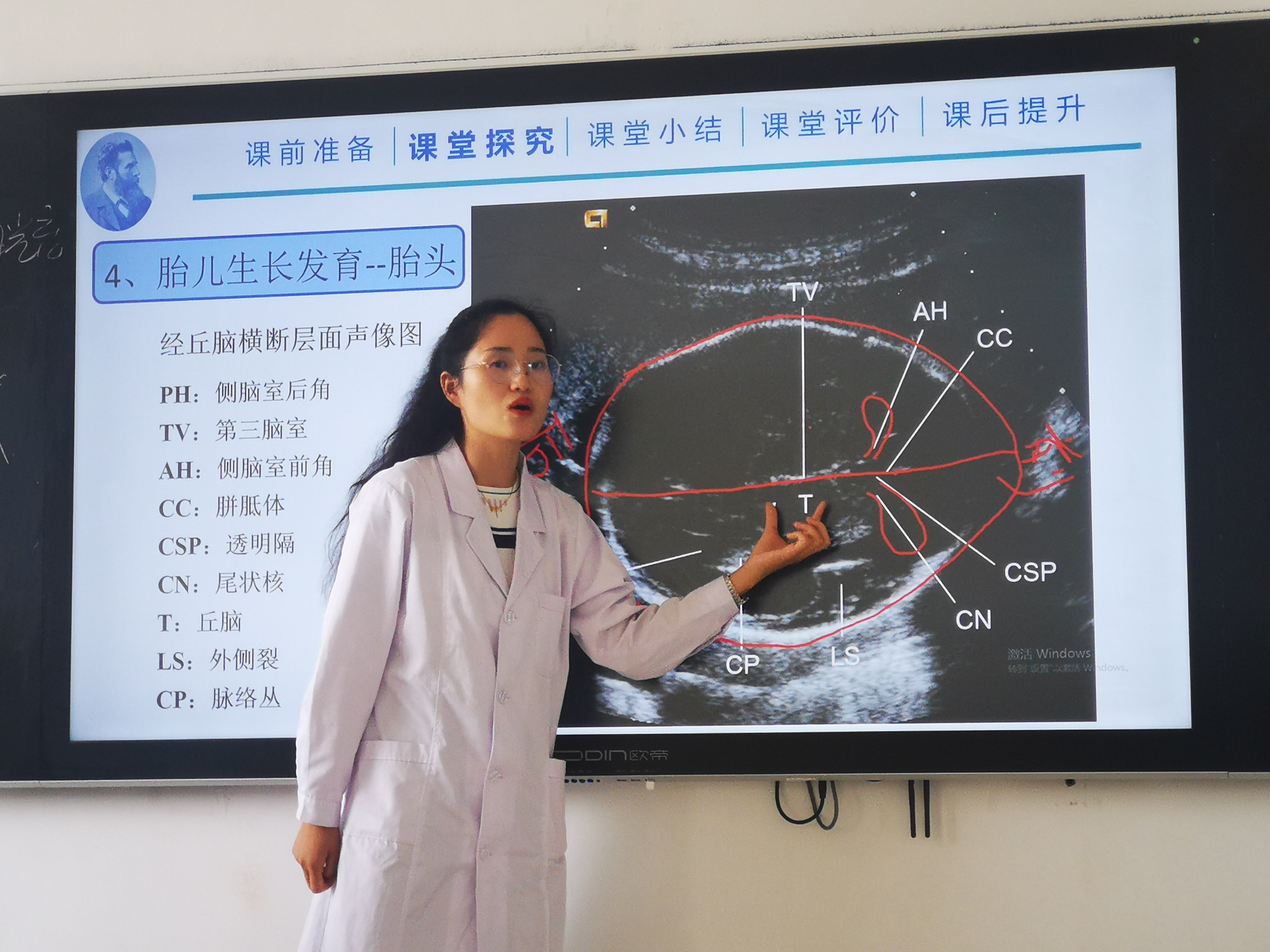 ♦ 吳雪老師帶領(lǐng)同學(xué)們在超聲實(shí)訓(xùn)室學(xué)習(xí)并講解《超聲檢查技術(shù)》理論教學(xué) ♦