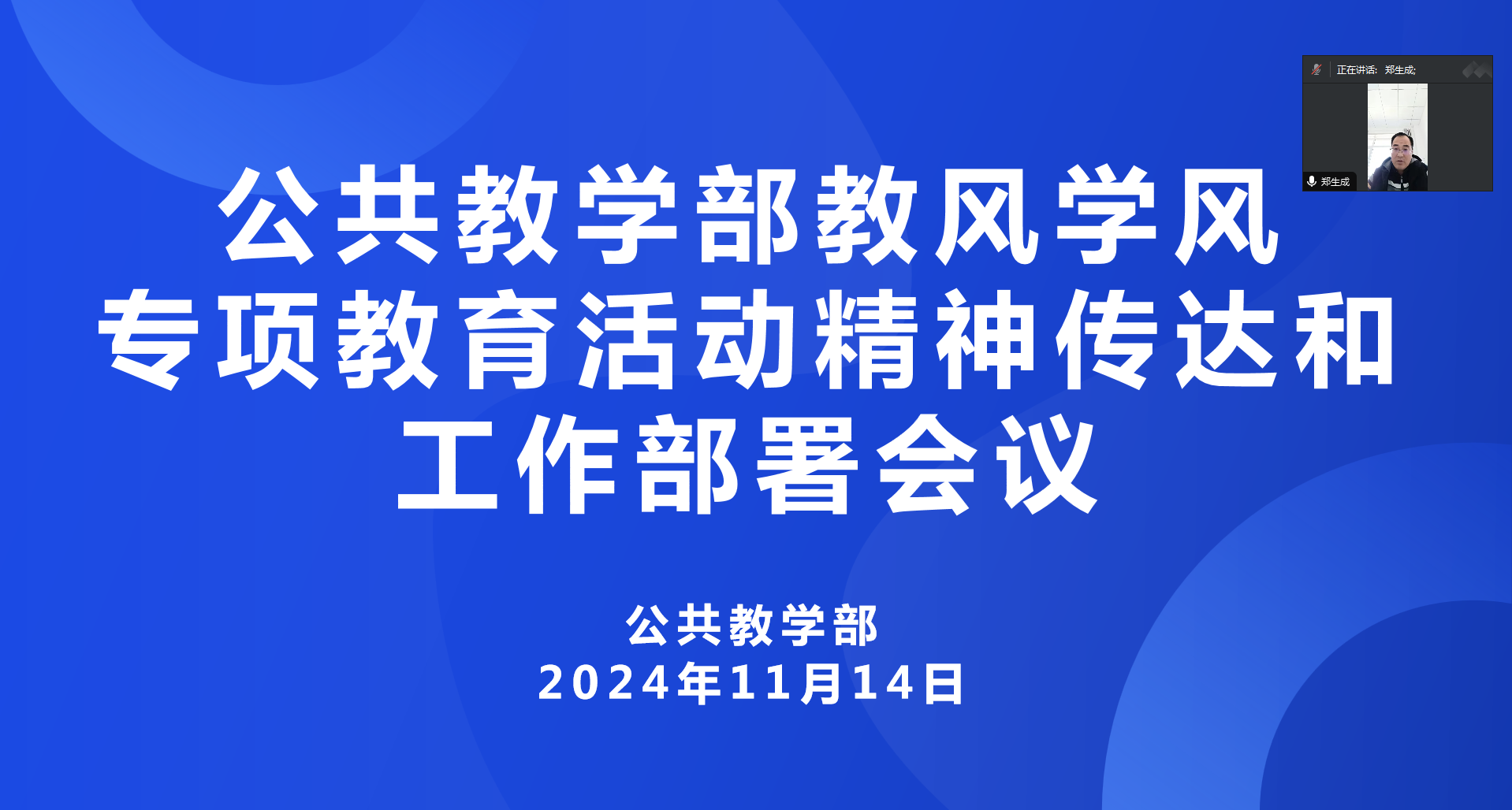 為深入貫徹落實學校教風學風專項教育活動動員大會精神,11月14日,公共教學部組織全體專兼職教師召開教風學風專項教育活動精神傳達和工作部署會議,會議由黨總支書記鄭生成主持。