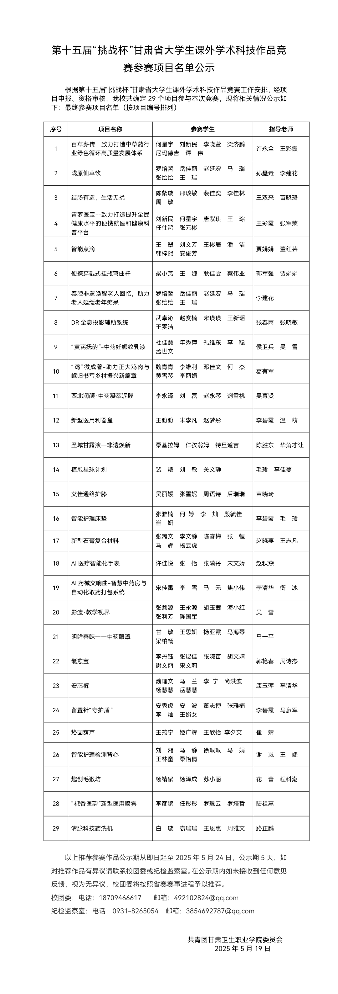 第十五屆“挑戰(zhàn)杯”甘肅省大學(xué)生課外學(xué)術(shù)科技作品競賽參賽項目名單公示