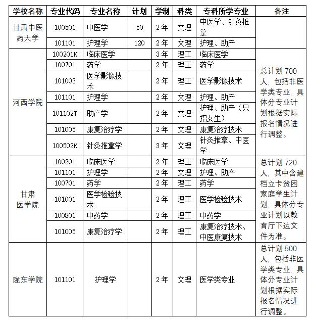 我校對(duì)口的醫(yī)學(xué)類本科學(xué)校:甘肅中醫(yī)藥大學(xué)、河西學(xué)院、甘肅醫(yī)學(xué)院、隴東學(xué)院。報(bào)考醫(yī)學(xué)類院校的考生,請(qǐng)以班級(jí)為單位統(tǒng)一遞交報(bào)名材料;報(bào)考非醫(yī)學(xué)類院校的考生,根據(jù)所報(bào)院校的要求,自行提交相關(guān)材料。