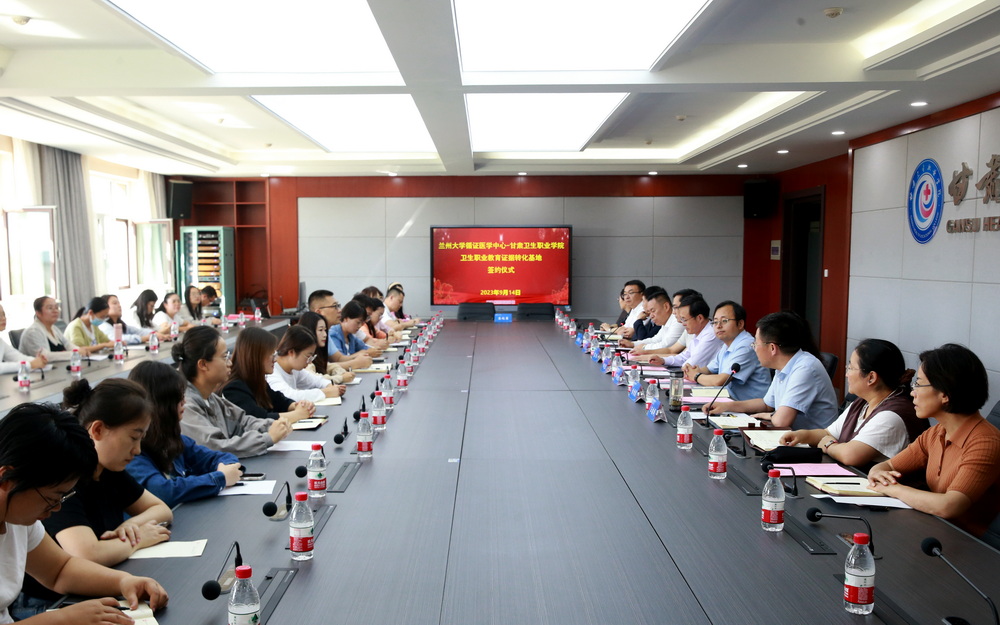 9月14日上午,蘭州大學(xué)-甘肅衛(wèi)生職業(yè)學(xué)院衛(wèi)生職業(yè)教育證據(jù)轉(zhuǎn)化基地在辦公樓315無紙化會(huì)議室揭牌成立。蘭州大學(xué)循證醫(yī)學(xué)中心主任、甘肅省循證醫(yī)學(xué)與臨床轉(zhuǎn)化重點(diǎn)實(shí)驗(yàn)室主任楊克虎教授,田金徽教授,葛龍研究員,李秀霞副教授,學(xué)校黨委書記包磊,黨委副書記、副校長(zhǎng)王建成以及40余名教師代表出席簽約儀式,儀式由學(xué)校副校長(zhǎng)高博主持。