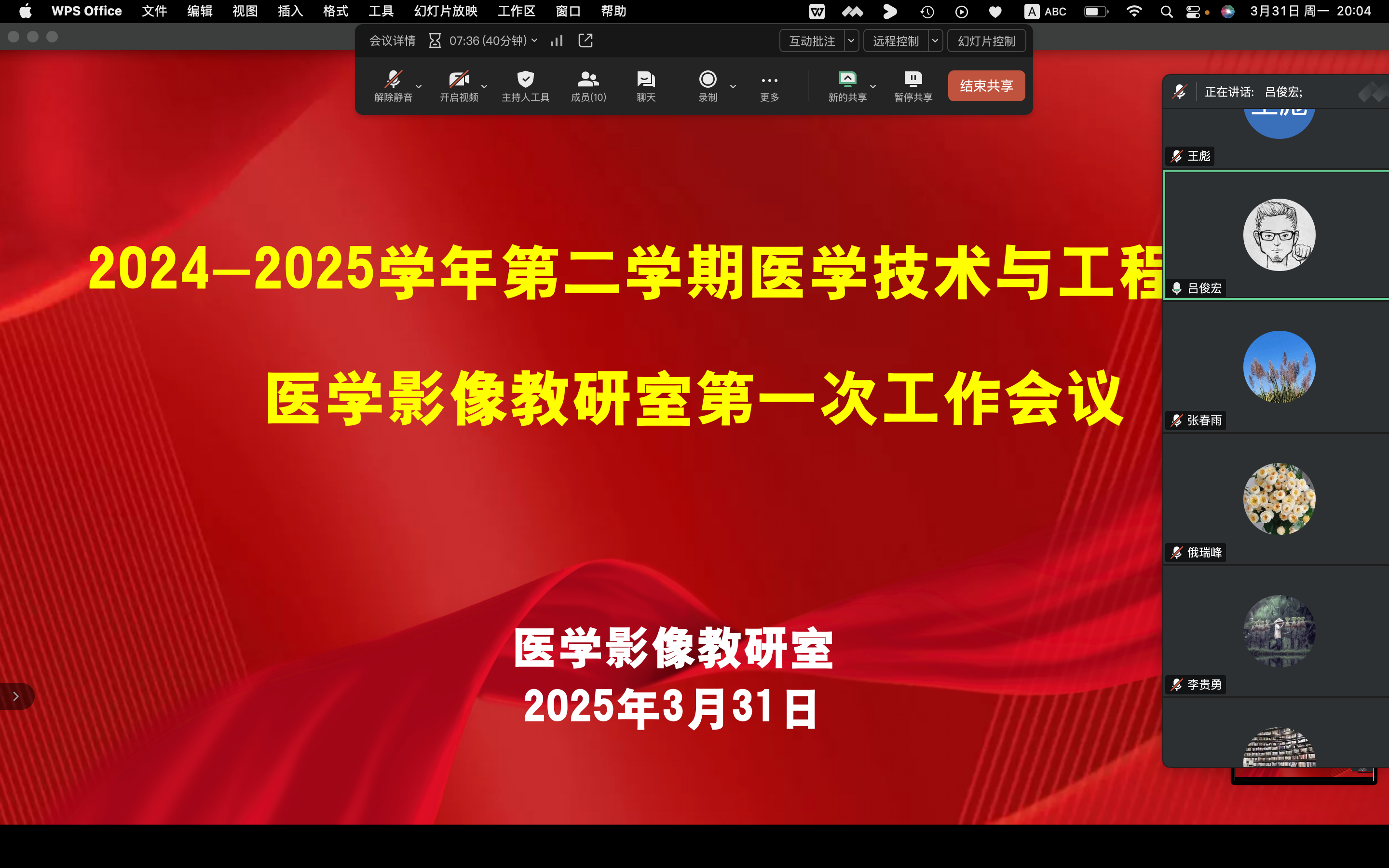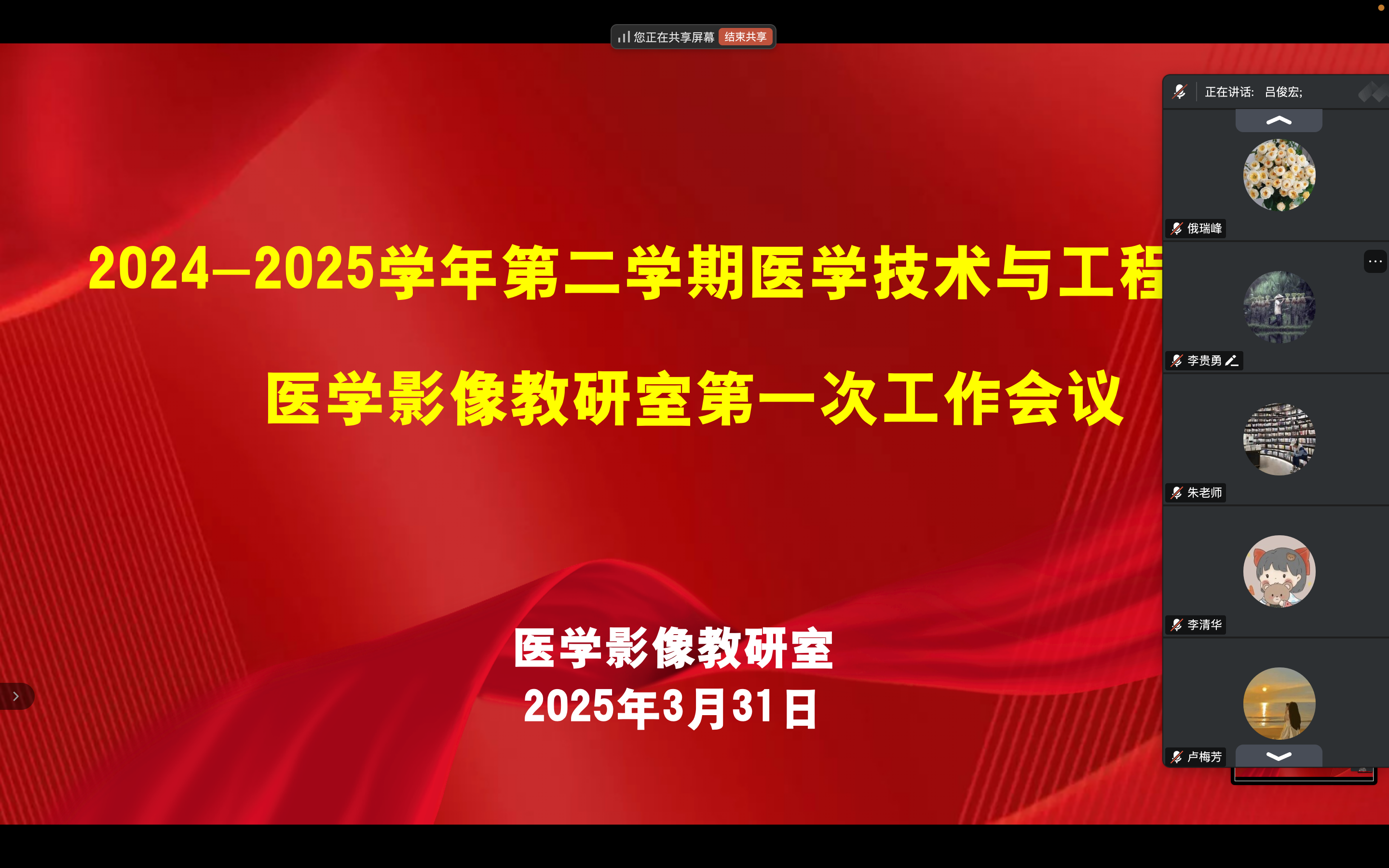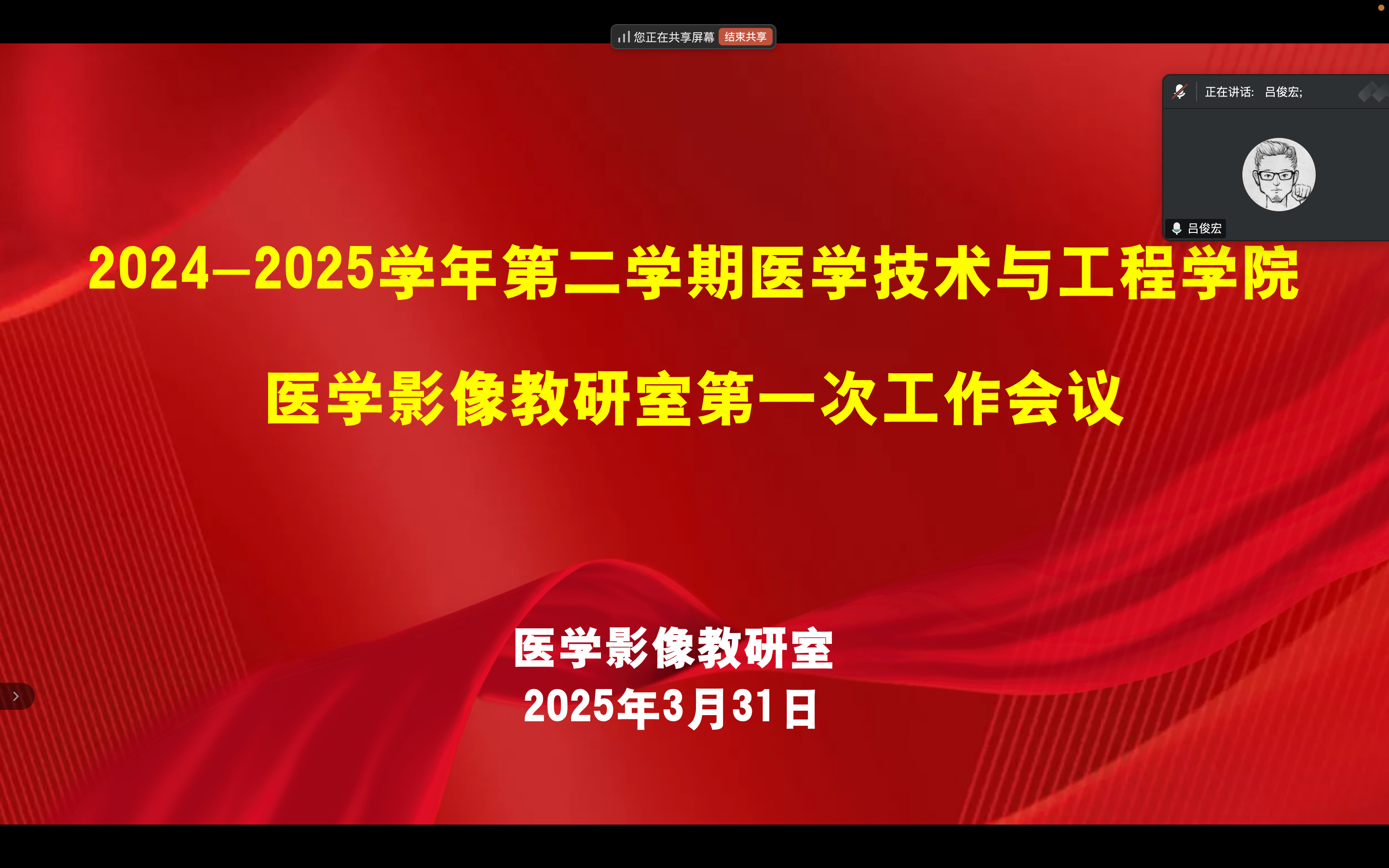 3月31日晚20:00~20:30,醫(yī)學影像與智能醫(yī)療裝備教研室于騰訊會議平臺,召開了“2024-2025學年第二學期教研室工作會議”。會議由呂俊宏主持,教研室全體教師參加會議。