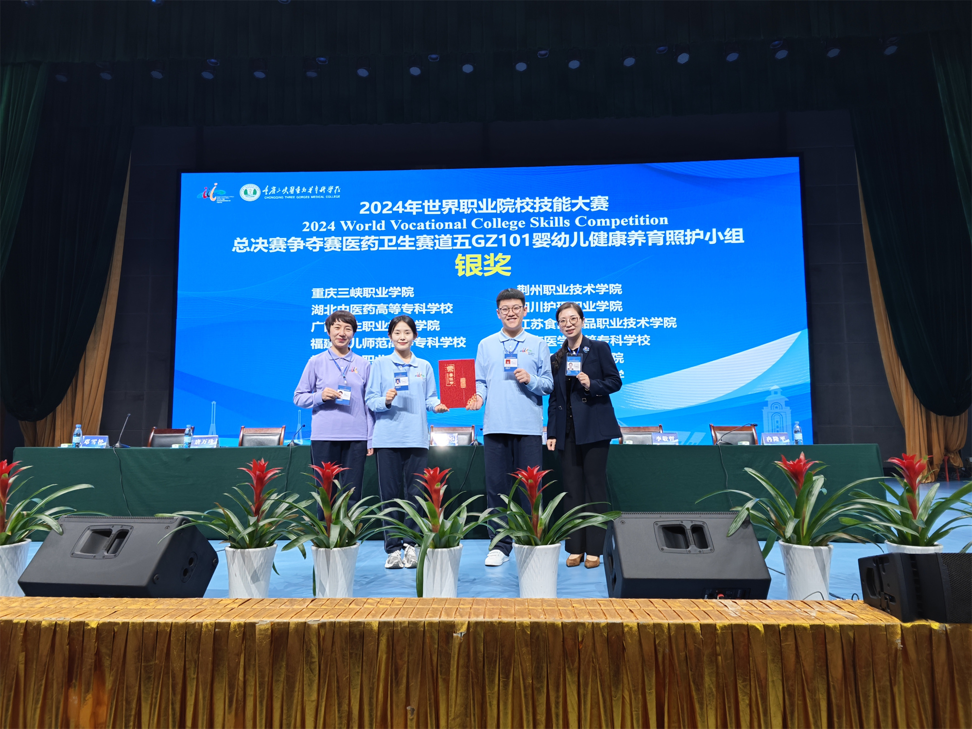 10月26日至30日,由教育部、國家發(fā)改委、科學(xué)技術(shù)部等35個部委主辦,重慶市教育委員會、重慶市衛(wèi)健委、重慶市萬州區(qū)人民政府承辦的2024年世界職業(yè)院校技能大賽總決賽醫(yī)藥衛(wèi)生賽道五(GZ101嬰幼兒健康養(yǎng)育照護(hù)小組)爭奪賽在重慶三峽醫(yī)藥高等專科學(xué)校隆重舉行。來自全國31個賽區(qū)的60支代表隊(duì),共計(jì)211名選手同臺競技。我校由羅麗芳和張妤老師指導(dǎo)的參賽選手吳環(huán)龍、牟蓉以平行組第2名榮獲銀獎。