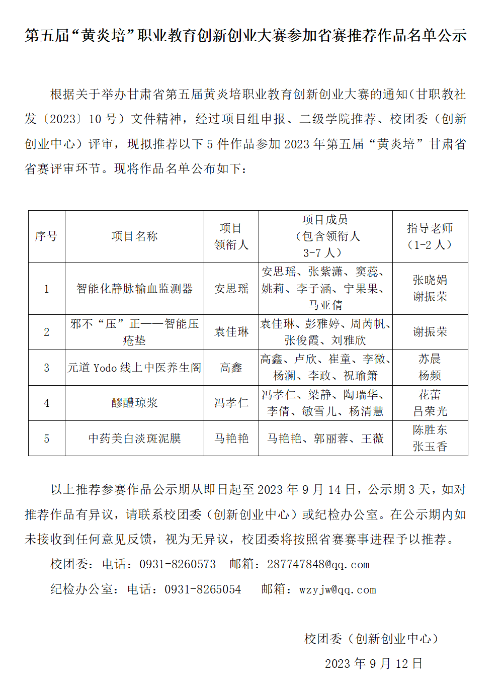 第五屆“黃炎培”職業(yè)教育創(chuàng)新創(chuàng)業(yè)大賽參加省賽推薦作品名單公示發(fā)布時間:2023-09-12 -