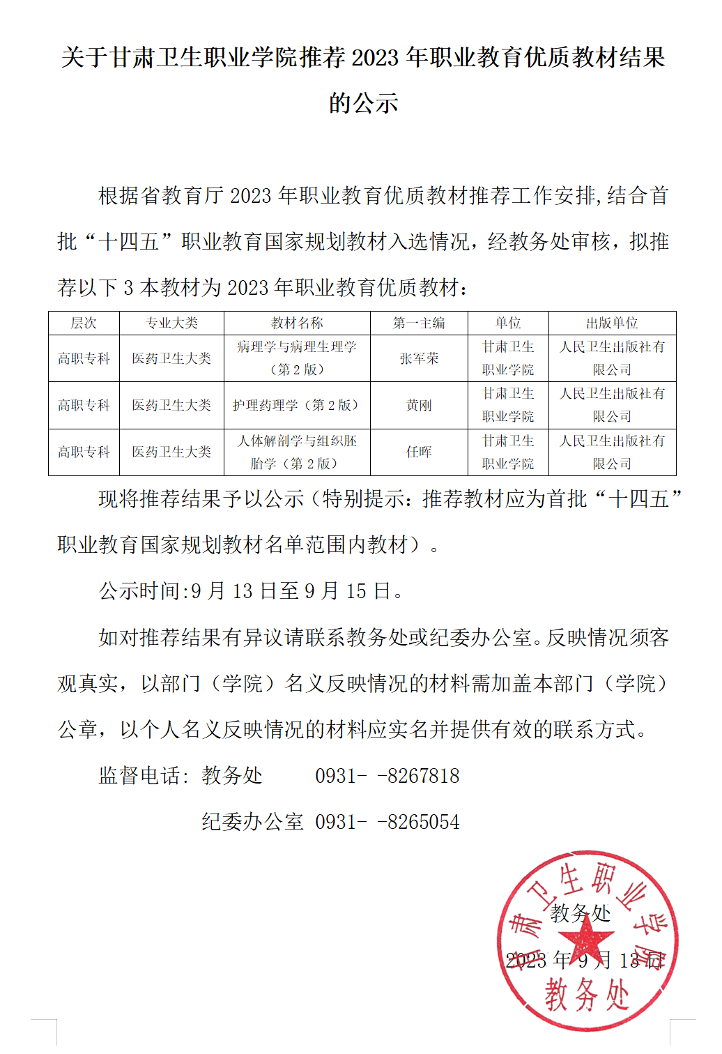 關(guān)于甘肅衛(wèi)生職業(yè)學(xué)院推薦2023年職業(yè)教育優(yōu)質(zhì)教材結(jié)果的公示發(fā)布時間:2023-09-12 -