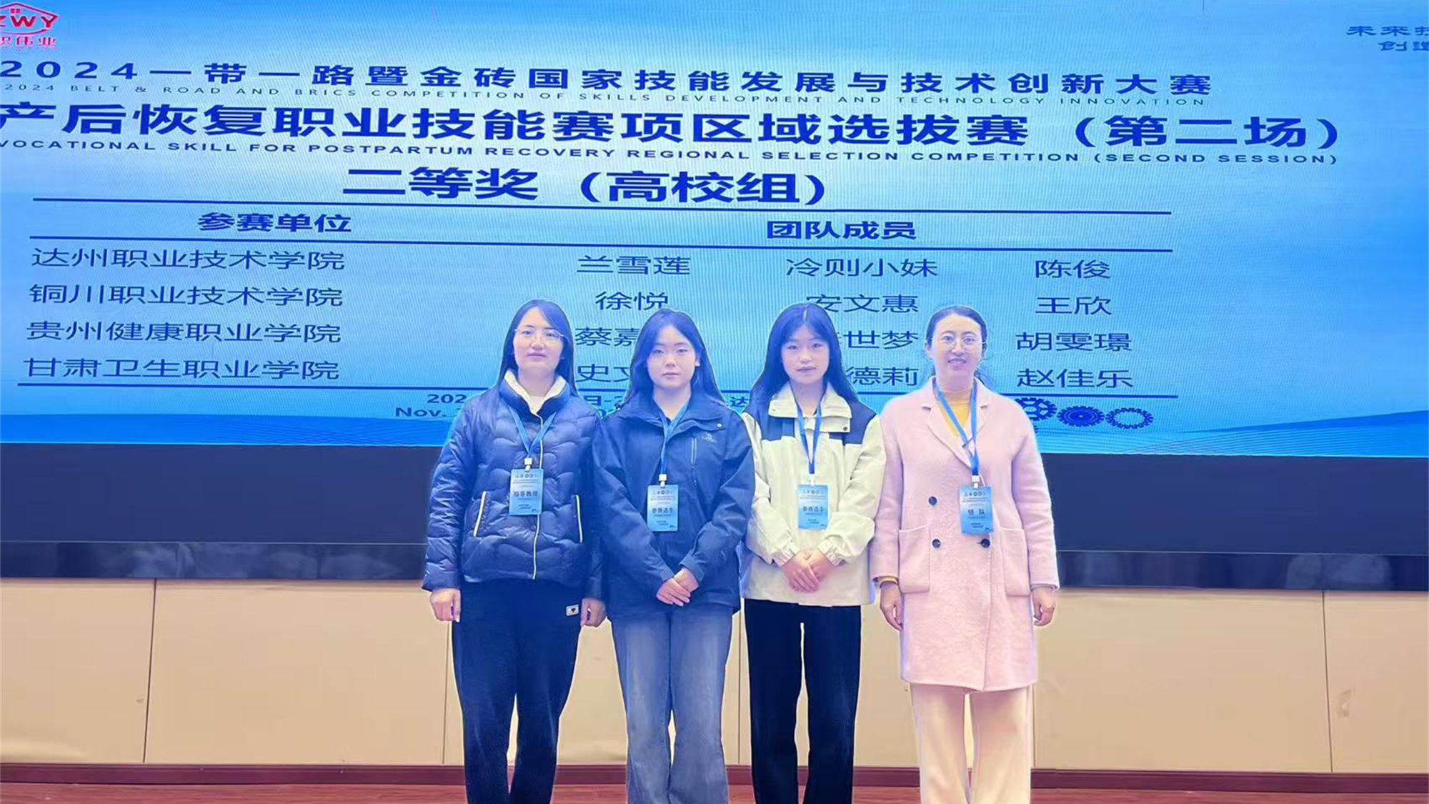 我校在“2024一帶一路暨金磚國(guó)家技能發(fā)展與技術(shù)創(chuàng)新大賽”首屆產(chǎn)后恢復(fù)職業(yè)技能賽項(xiàng)選拔賽中榮獲二等獎(jiǎng)發(fā)布時(shí)間:2024-11-26 -