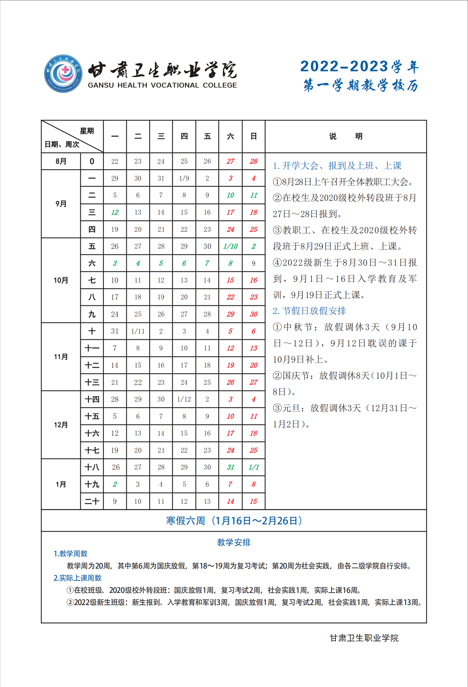 甘肅衛(wèi)生職業(yè)學(xué)院2022-2023學(xué)年第一學(xué)期教學(xué)校歷發(fā)布時(shí)間:2022-07-20