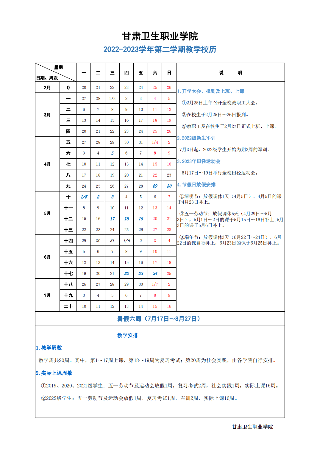 甘肅衛(wèi)生職業(yè)學(xué)院 2022-2023學(xué)年第二學(xué)期教學(xué)校歷發(fā)布時(shí)間:2023-01-19
