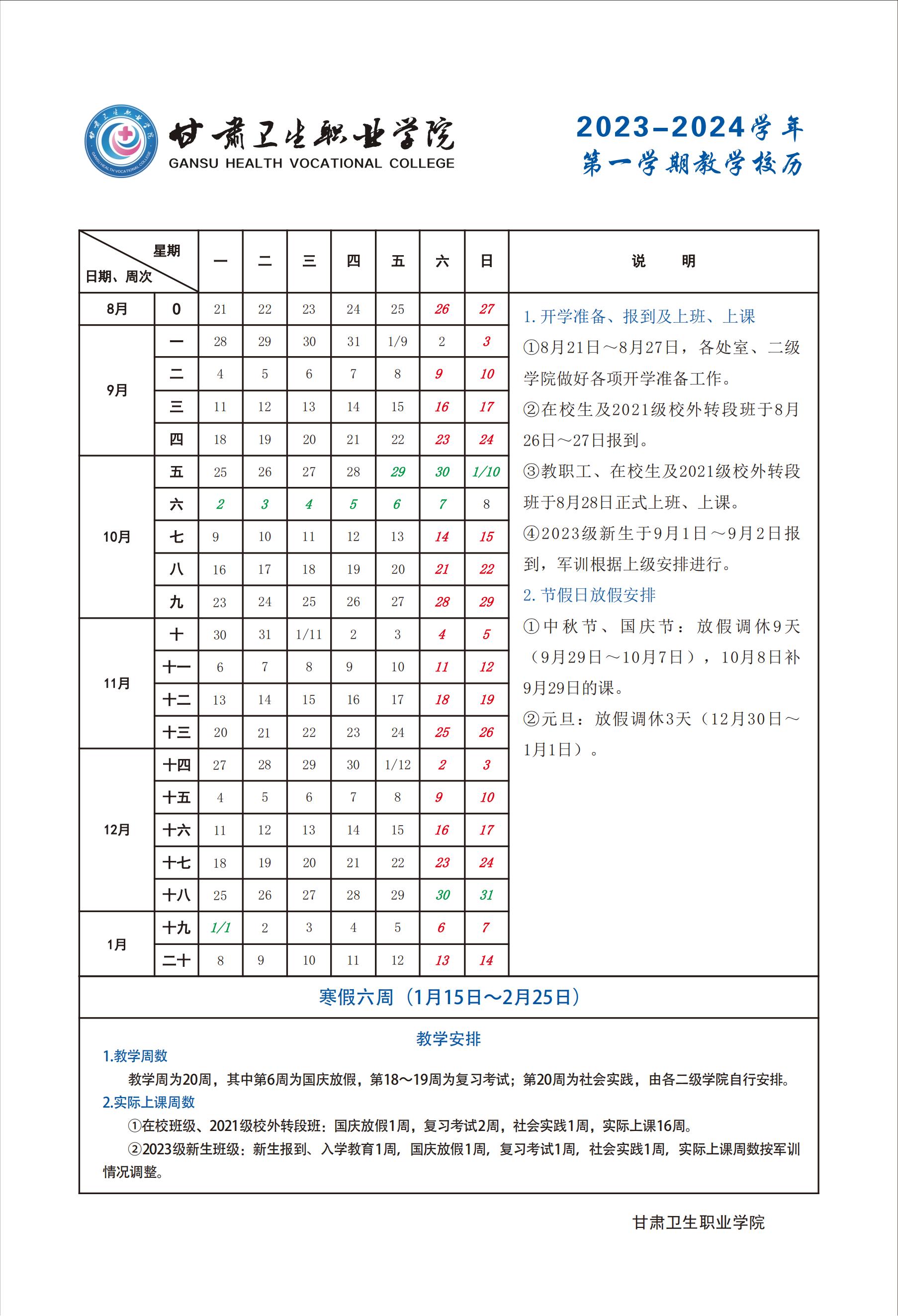 甘肅衛(wèi)生職業(yè)學(xué)院2023-2024學(xué)年第一學(xué)期教學(xué)校歷發(fā)布時(shí)間:2023-07-20