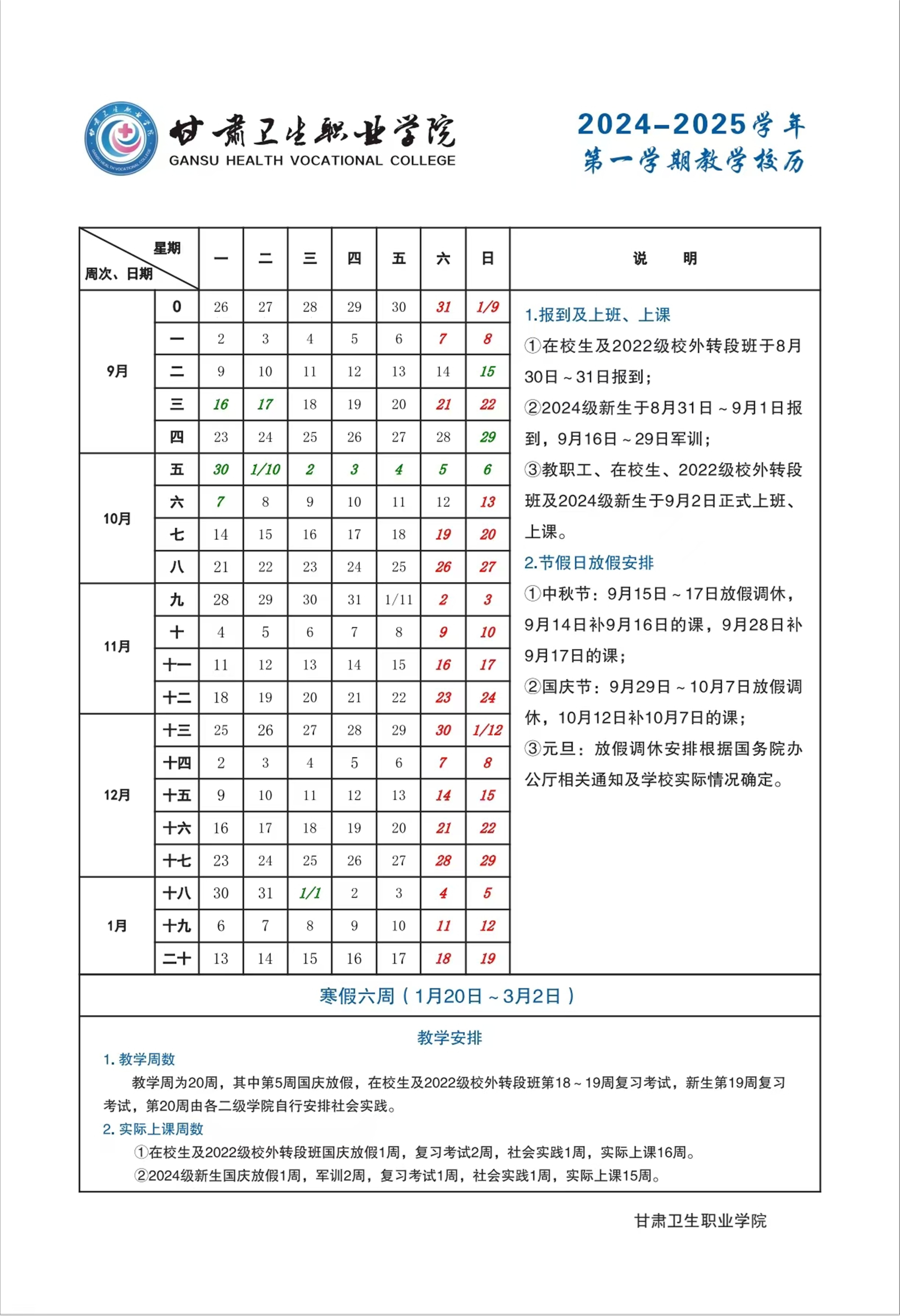甘肅衛(wèi)生職業(yè)學(xué)院2024-2025學(xué)年第一學(xué)期教學(xué)校歷發(fā)布時(shí)間:2024-09-13