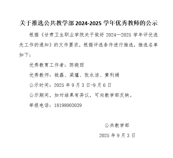 關(guān)于推選公共教學(xué)部2024-2025學(xué)年優(yōu)秀教師的公示