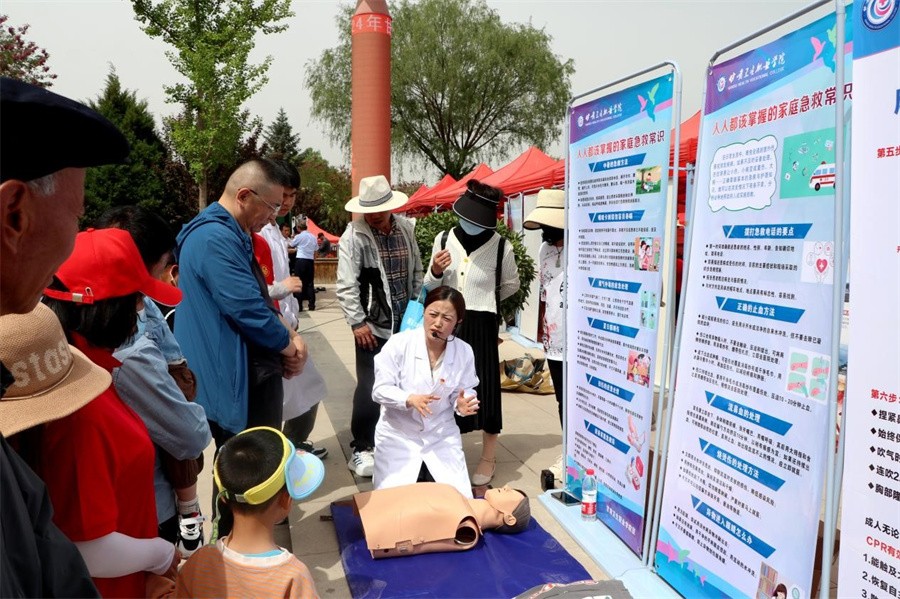 在我校展臺(tái)處,中醫(yī)藥學(xué)院教師、中醫(yī)世家李世昌大夫現(xiàn)場(chǎng)開展義診活動(dòng),為當(dāng)?shù)乩习傩瞻衙}問(wèn)診、開具藥方,進(jìn)行健康指導(dǎo);臨床護(hù)理學(xué)院副院長(zhǎng)寇桂香,臨床二教研室主任賈娟娟現(xiàn)場(chǎng)開展院外心肺復(fù)蘇技術(shù)演示和教學(xué),發(fā)放家庭常用急救知識(shí)宣傳單,結(jié)合展板講解常見急癥的家庭救治要點(diǎn);附屬醫(yī)院護(hù)師龐麗娜帶領(lǐng)學(xué)校護(hù)理專業(yè)學(xué)生為群眾測(cè)量血壓,發(fā)放由學(xué)校編輯制作的老年人常見病宣教手冊(cè),普及健康知識(shí);附屬醫(yī)院理療師楊雪瑞為現(xiàn)場(chǎng)群眾進(jìn)行頸椎推拿按摩服務(wù),講解中醫(yī)保健知識(shí),傳播中醫(yī)文化。學(xué)校展臺(tái)前人頭攢動(dòng),前來(lái)咨詢問(wèn)診的群眾絡(luò)繹不絕。