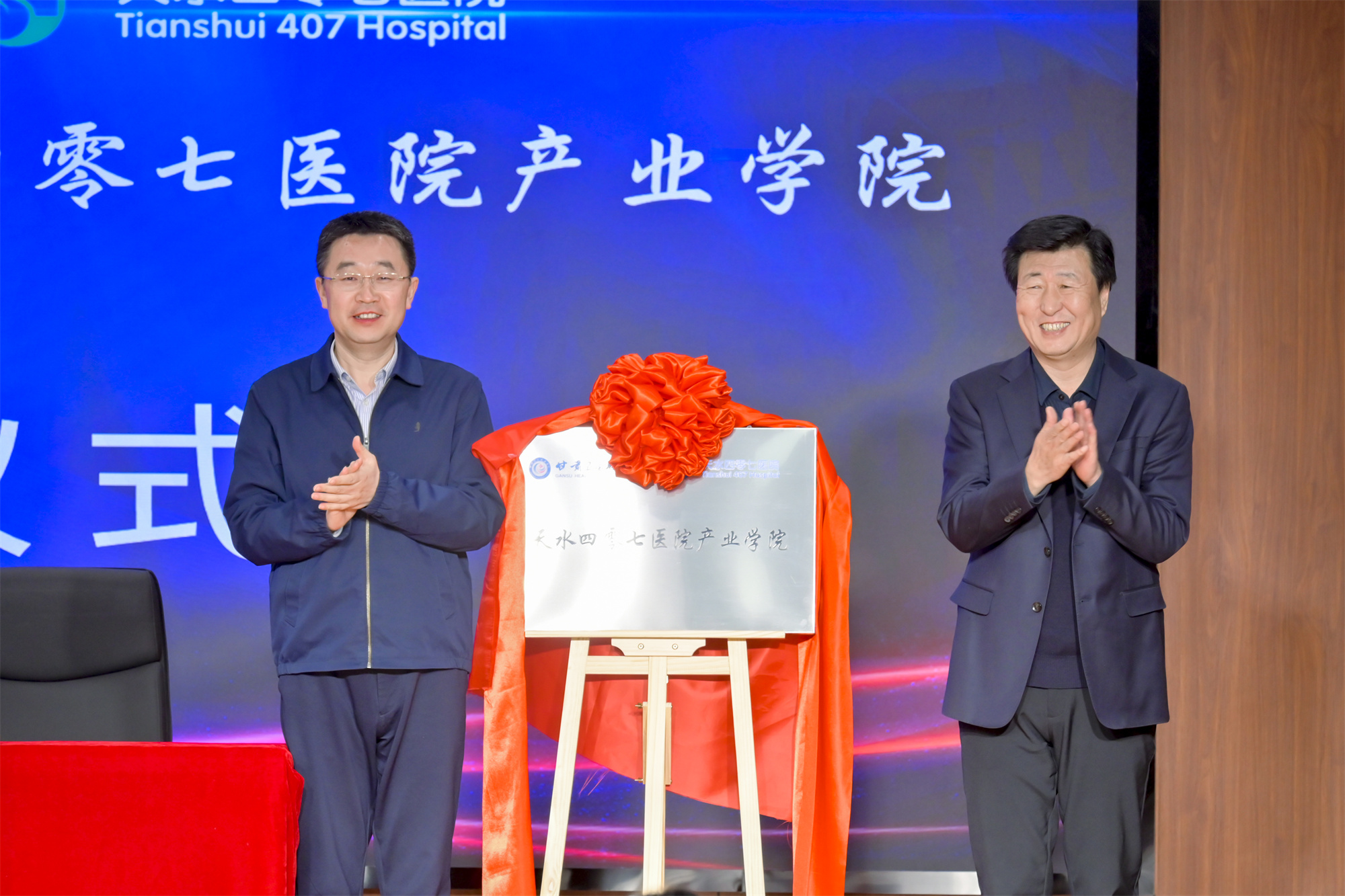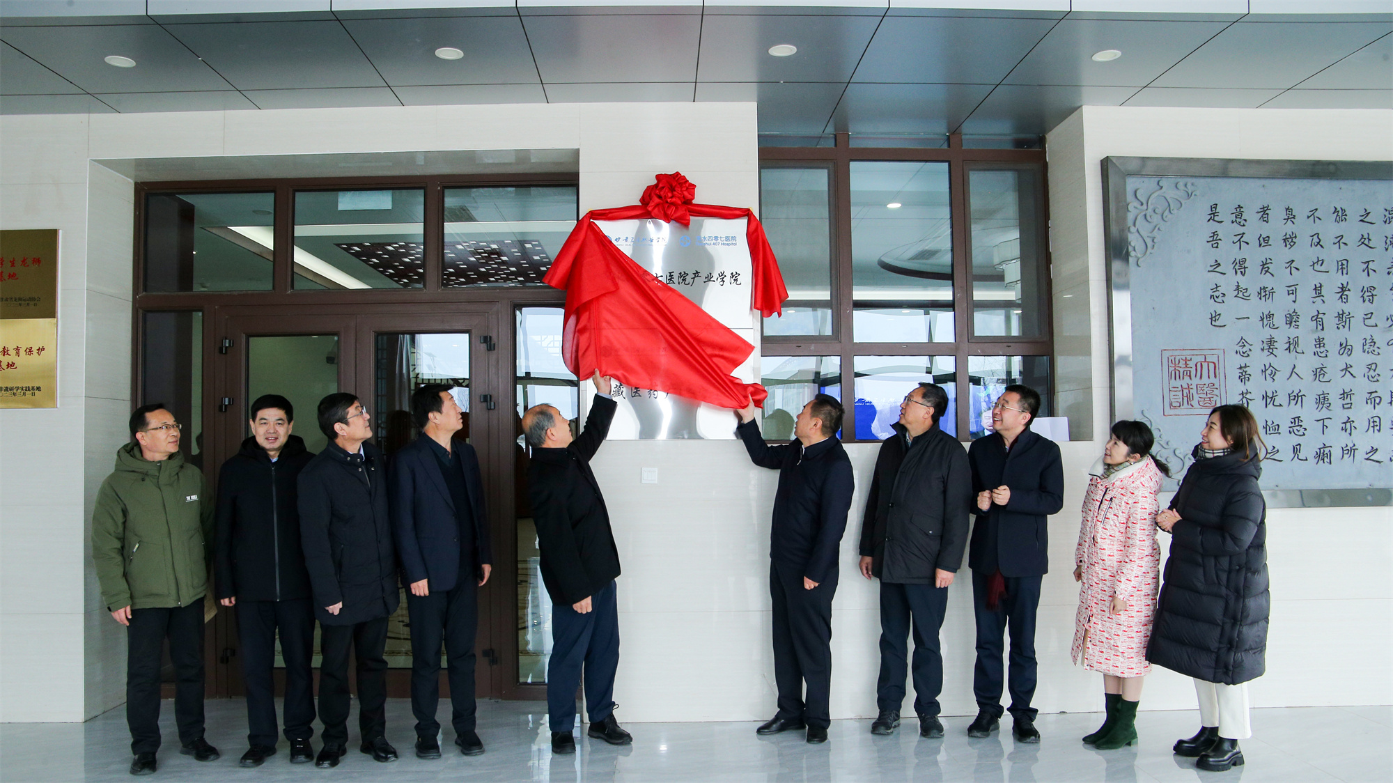 甘肅省醫(yī)藥健康產(chǎn)業(yè)發(fā)展協(xié)會李存文會長、甘肅衛(wèi)生職業(yè)學院包磊書記、王建成校長和天水四零七醫(yī)院楊友良董事長共同為“甘肅衛(wèi)生職業(yè)學院天水四零七醫(yī)院產(chǎn)業(yè)學院”揭牌。
