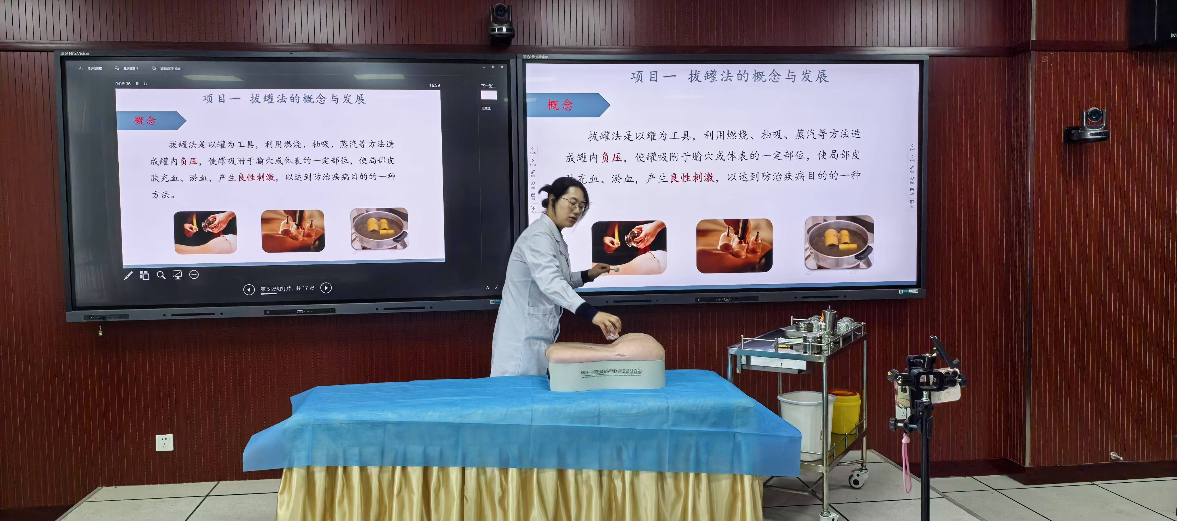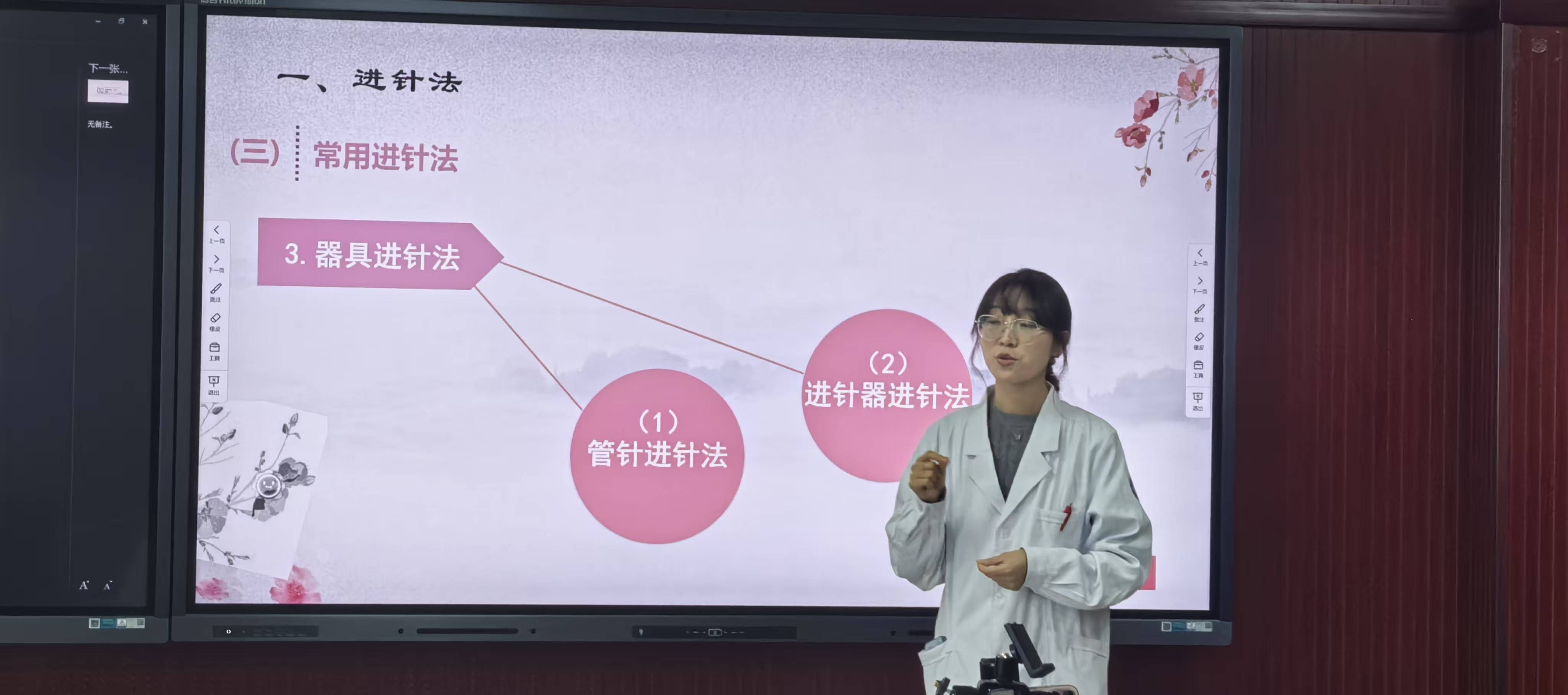 試講教師安惠、吳巧珍、周娜分別就各自的專業(yè)課程進(jìn)行試講展示。安惠老師試講《中醫(yī)診斷學(xué)》課程,以“望神”為主題,采用視頻導(dǎo)入,深入淺出地講解了中醫(yī)望診中觀察患者精神狀態(tài)的重要性及具體方法,案例講解細(xì)致入微,風(fēng)格親切自然,語言流暢。吳巧珍老師試講《針灸學(xué)》課程,她以“進(jìn)針手法”為切入點(diǎn),詳細(xì)闡述針灸治療中進(jìn)針手法和注意事項(xiàng),示范了多種進(jìn)針手法,展示出嫻熟的技能操作及扎實(shí)的理論功底。周娜老師試講拔罐操作,現(xiàn)場演示拔罐的具體操作流程和注意事項(xiàng),操作規(guī)范,動(dòng)作流程。