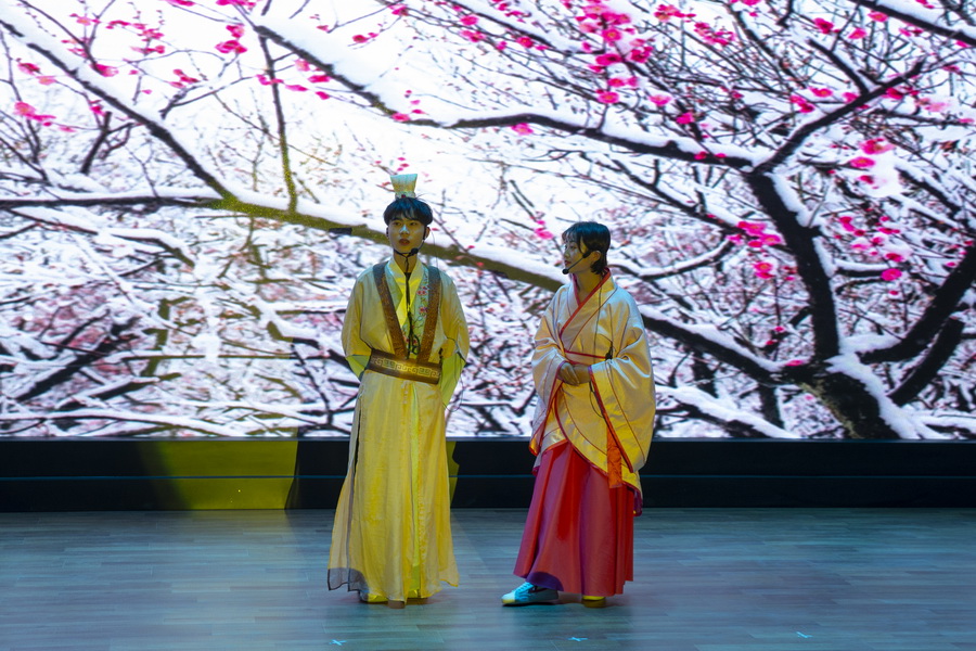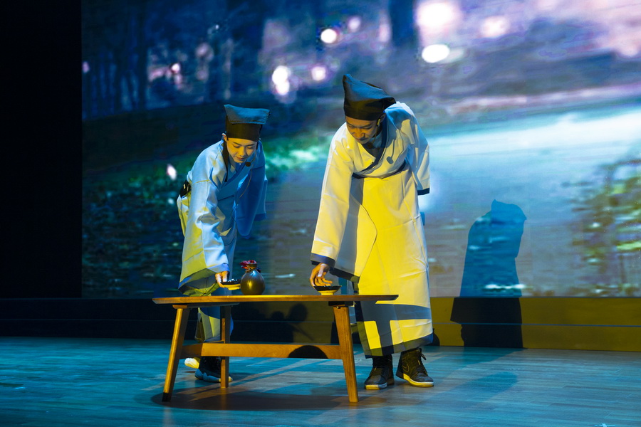 生死篇,古道人來(lái)人往,穿梭衣的男子在阡陌小路上行走,清明的異鄉(xiāng)恰逢清明雨,思起故鄉(xiāng),黃土衰草,滿心愁情不如清酒一壺,此時(shí),杜牧問(wèn)了小童;莊子與學(xué)生在學(xué)堂論道;“勸君莫惜金縷衣,勸君惜取少年時(shí)”儂儂軟語(yǔ)在女嬌娥的輕歌曼舞里;生命開出絢爛花最終綻放在“苔花如米小,也學(xué)牡丹開”的傲然中。與會(huì)嘉賓在《苔》的歌聲中合影留念,記錄美好光陰。