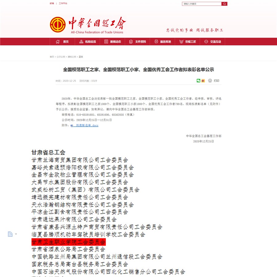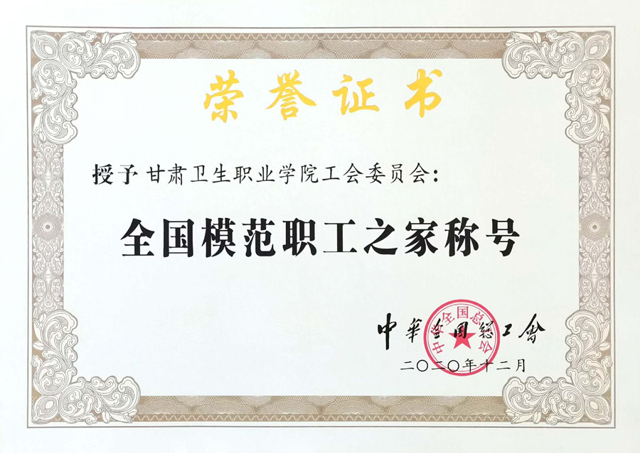 2020年底,在中華全國(guó)總工會(huì)組織的全國(guó)模范職工之家評(píng)選活動(dòng)中,經(jīng)甘肅省教科文衛(wèi)工會(huì)選拔、推薦,甘肅衛(wèi)生職業(yè)學(xué)院工會(huì)被授予“全國(guó)模范職工之家”稱(chēng)號(hào)。
