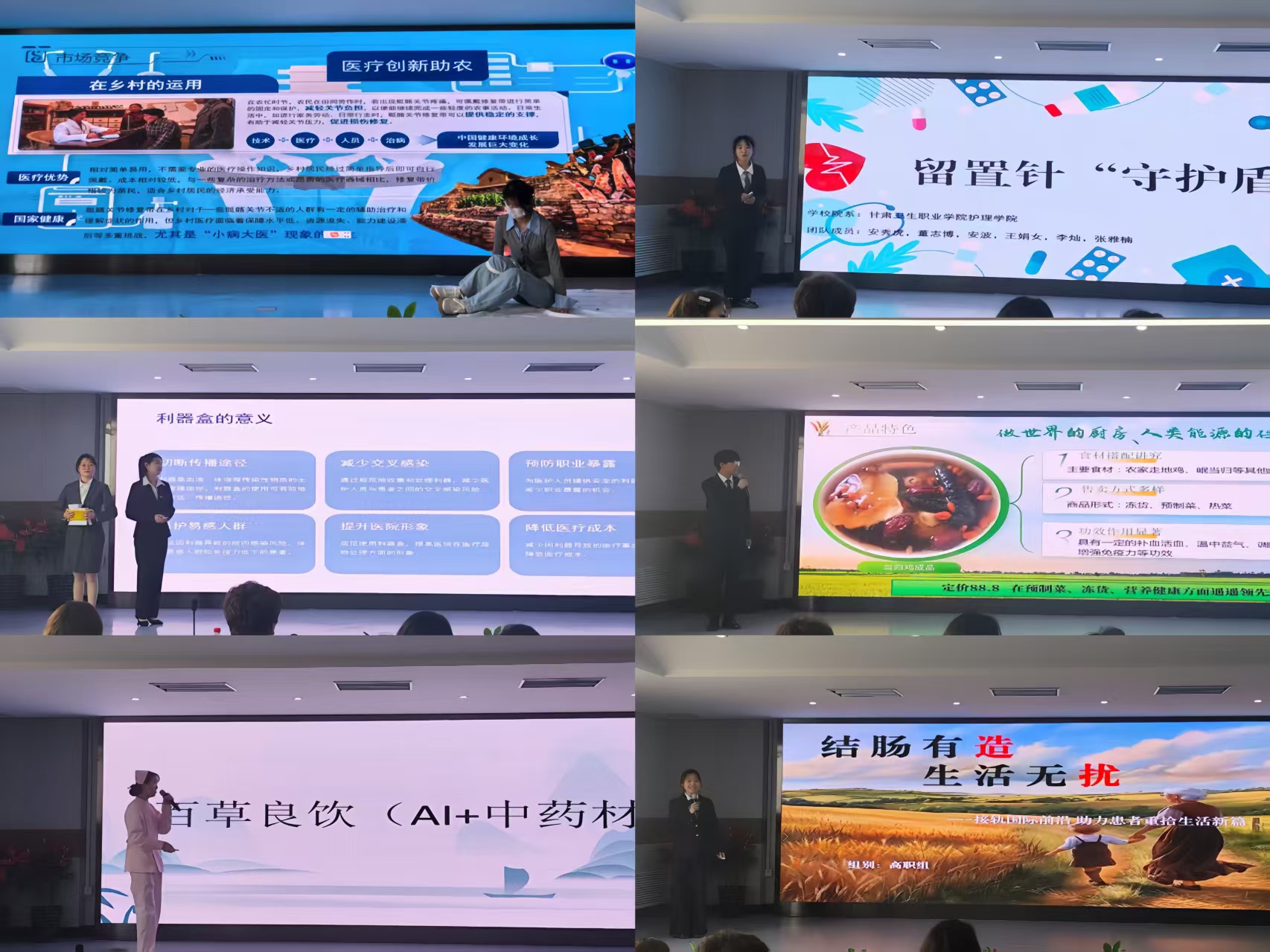 大賽自啟動(dòng)以來,共有 170 部作品參賽,經(jīng)過初賽、復(fù)賽的層層篩選,24 支團(tuán)隊(duì)脫穎而出,齊聚決賽現(xiàn)場(chǎng),展開巔峰對(duì)決。決賽現(xiàn)場(chǎng),各團(tuán)隊(duì)圍繞智慧醫(yī)療、老年照護(hù)、健康管理等當(dāng)下熱點(diǎn)領(lǐng)域,進(jìn)行項(xiàng)目路演和答辯。在4個(gè)小時(shí)的激烈比拼中,評(píng)委從項(xiàng)目創(chuàng)新性、可行性、市場(chǎng)前景等多維度進(jìn)行綜合評(píng)定,最終評(píng)選出一等獎(jiǎng)2部、二等獎(jiǎng)5部、三等獎(jiǎng)7部。獲獎(jiǎng)團(tuán)隊(duì)?wèi){借突出的表現(xiàn),贏得了評(píng)委和現(xiàn)場(chǎng)觀眾的高度認(rèn)可,充分展現(xiàn)出護(hù)理學(xué)院學(xué)生對(duì)創(chuàng)新創(chuàng)業(yè)大賽的敏銳洞察力。