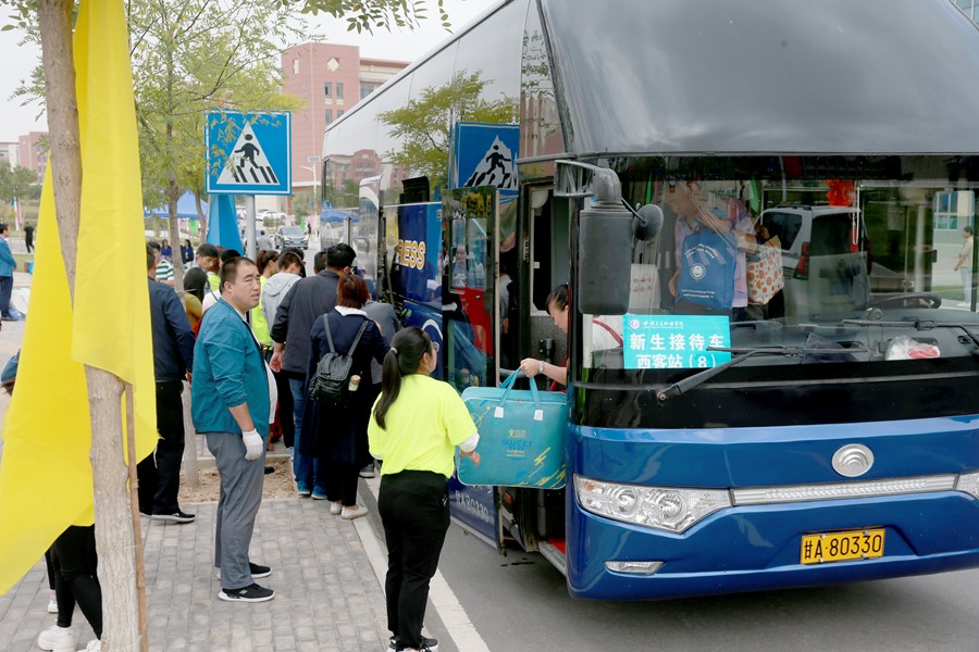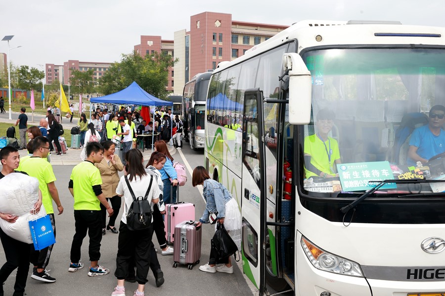 報到當天,我校在蘭州火車站、蘭州西站、職教園區(qū)公交樞紐站設置了校外迎新站,接待新生和家長,并安排大巴轉(zhuǎn)運至蘭州新區(qū)學校報到點。