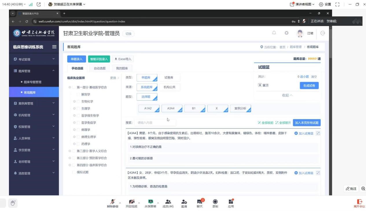 培訓(xùn)中,技術(shù)人員詳細(xì)介紹了平臺(tái)題庫的設(shè)置與種類,涵蓋了臨床醫(yī)學(xué)各學(xué)科的知識(shí)點(diǎn),并演示了題庫導(dǎo)入、試卷生成、考試創(chuàng)建及評(píng)分等操作流程,現(xiàn)場解答了教師們的疑問。