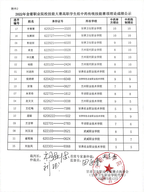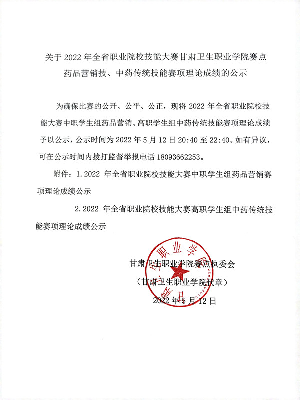 關于2022年全省職業(yè)院校技能大賽甘肅衛(wèi)生職業(yè)學院賽點藥品營銷技能、中藥傳統(tǒng)技能賽項理論成績的公示
