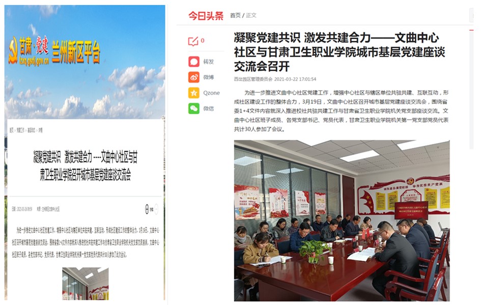 甘肅黨建、今日頭條平臺報道我校機關第一黨支部與文曲中心社區(qū)黨支部舉辦基層黨建座談交流會發(fā)布時間:2021-04-02 -
