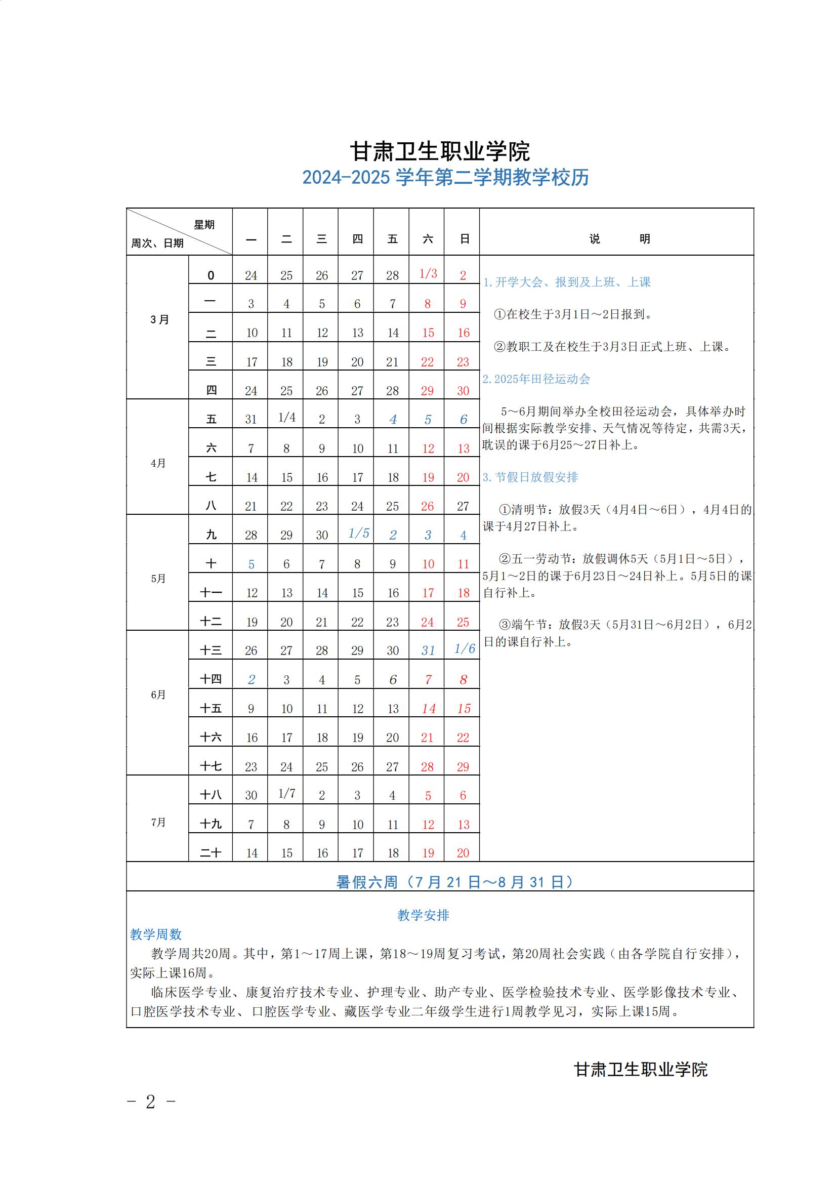 甘肅衛(wèi)生職業(yè)學(xué)院2024-2025學(xué)年第二學(xué)期教學(xué)校歷發(fā)布時(shí)間:2025-05-21