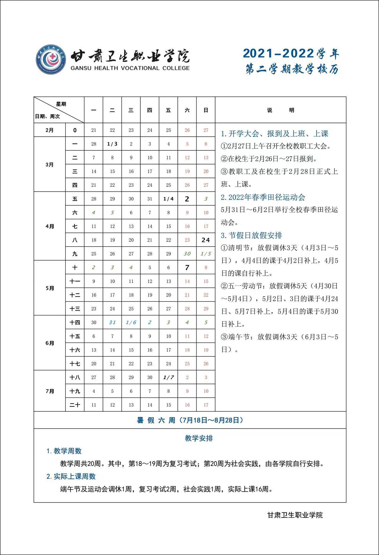 甘肅衛(wèi)生職業(yè)學(xué)院2021-2022學(xué)年第二學(xué)期教學(xué)校歷發(fā)布時(shí)間:2022-02-28